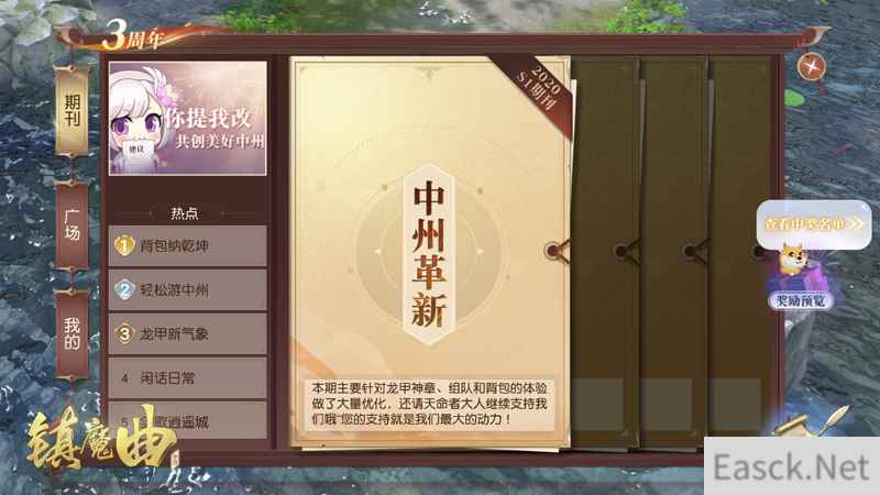 更美好的中州,你我一起创建 三周年庆典上,“中州革新”计划也正式启动。专属页面长期开放,首批28条意见、建议已被采纳,2月4日将公开抽取幸运的天命者送上好礼!, 天命者们在游戏中遇到的问题、希望改进的地方,以及对中州大地未来发展的一切建议,皆可在此畅所欲言、与其他天命者互动交流。特别开放的期刊,将定期记录被采纳的内容,天命者们可以前往查看、监督开发组的改进与革新。