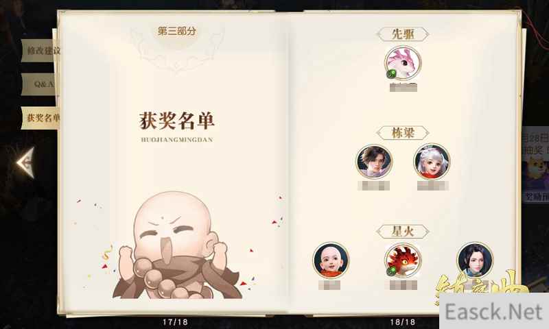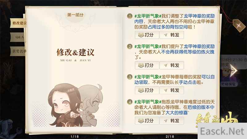 随时查看,监督开发组改进 奖励多多,固定抽奖福利足 除了提供建议时开领取的一次性奖励外,《镇魔曲》还天命者们准备了额外福利,以此回报天命者们三年的陪伴、积极提供的意见与建议。所有认真填写、参与“中州革新”计划的天命者,皆有机会在固定的开发组抽奖活动中,成为当期幸运锦鲤!抽奖当天,所有天命者皆可至期刊页面,全程观看抽奖直播、见证锦鲤诞生。被抽中的天命者,就有机会羸取各类珍稀道具、高级图纸、套装等丰厚福利!