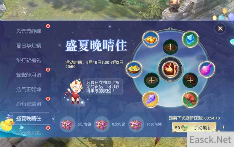 此后,天命者可向夏日女神进贡,以为一日祭典之完结。药品、烹饪、铭纹、灵兽技能书等,女神所需贡品多样,或以绑定元宝为媒介刷新女神所需物品。每次进贡,女神均会回以经验奖励,若达5次、8次、10次者,女神还将降下佳人醉、好事近、银币等奖励,福利丰厚。