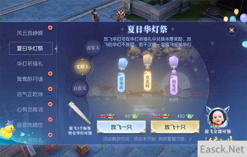 擂台挑战、击退妖邪,于天命者而言无非活动筋骨热热身。运动完毕后,不妨回到盛典之上,择一二静中赏景之事,比如来到自在天、喜乐天、光明天中放飞夏日华灯,看那满天灯火处处,再许下自己心愿,可好?通过祭典活动或以钱货购买,收集不同华灯放飞后,即有限时挂饰送上,还可兑换神决点数、镇魂券、摘星契约、沉香玉、龙吟锋毫、4星满级木须龙等超稀有奖励!