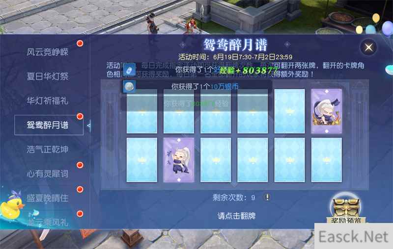 同时,天命者若参与其他活动,不仅能获得华灯,还可收获“鸳鸯醉月谱”中翻牌机会。每次机会均可翻牌2张,若其角色相同即可获奖励。每日里,中州各服第一位全数翻开的天命者,亦有"天降传奇·涅槃"奖励及限时1天的紫色图片称谓“别具慧眼”送上,奖励不可谓不丰! 心有灵犀、盛夏晚晴,轻松参与福利多