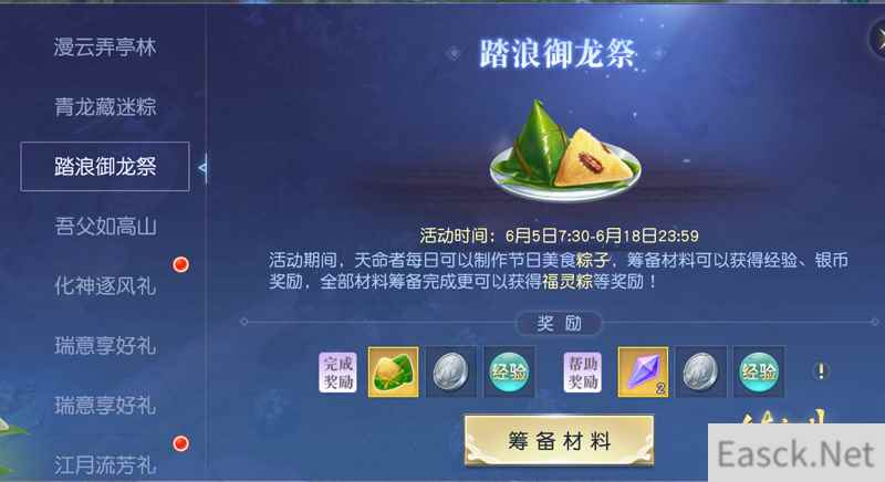 香粽材料散各处,端午佳节筹备忙 妆点家园、参与投票之余,天命者们也莫要忘了中州百姓的请愿,帮助他们筹备端午节庆一应所需。 至6月18日止,天命者每日均可帮助中州百姓制作粽子,前往各地筹备所需材料。每份材料,均会折算为相应银币、经验以为答谢,若筹备完当天的材料,还可收获“福灵粽”等特殊礼物。这些材料有的寻常可见,有的获取较难,天命者们可向帮会其他成员求助或帮助其他人筹备材料,若获助完成亦有双方奖励送上。