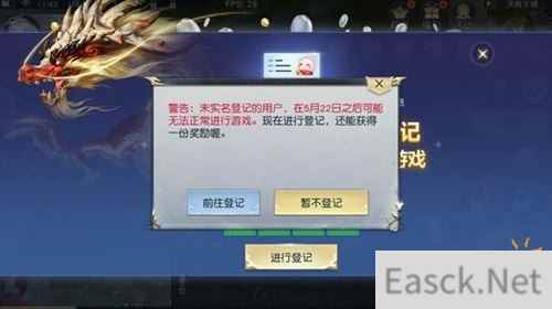 ▲即日起登录游戏就会出现游戏实名登记页面(已经认证的不会弹窗) 如果不小心关掉了实名登记填写页面,天命者大人还可以点击左上角栏位中的【实名】按钮来打开界面,并点击“进行登记”进入实名登记页面填写,便能完成游戏实名注册。