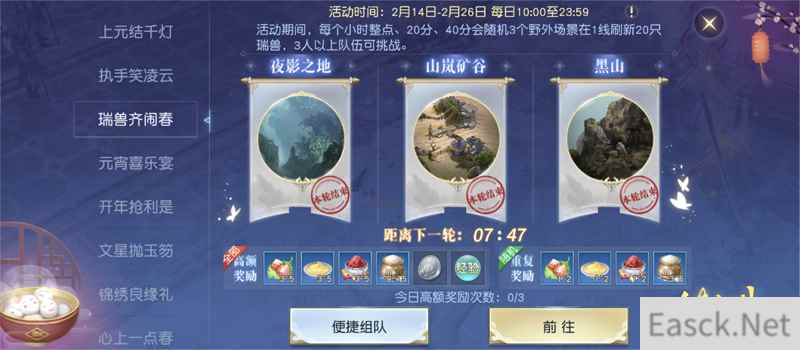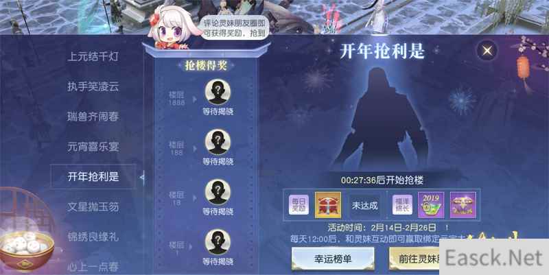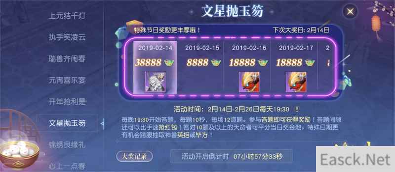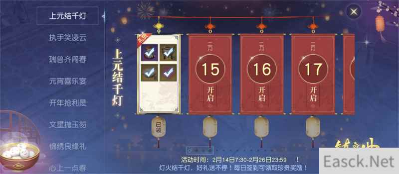 活动期间,每天在“上元结千灯”里签到均有不同好礼送上,各类福袋、珍稀材料、浓情元宵等每天换新;“开年抢利是”抢楼拿奖励,还有每日幸运抽奖,海量绑定元宝大放送;“文星抛玉笏”答题拿奖励,最高38888绑定元宝带回家;“瑞兽闹新春”活动中每小时均有瑞兽出没,击退即有海量银币、经验等领取;“一品盏中意”抽取元宵,丰厚奖励只看你的运气!