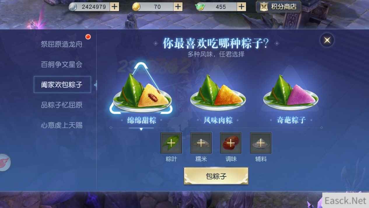 限时礼包大优惠,奖励丰厚别错过 在端午期间,天命者们还能以三折的超优惠价格买到两种端午礼包!各类葫芦、乾坤袋、银币、粽子材料,以及限时坐骑及大量珍稀道具尽在其中!每种礼包限购一个,超值奖励不容错过! 阖家欢包粽子 品粽子忆屈原