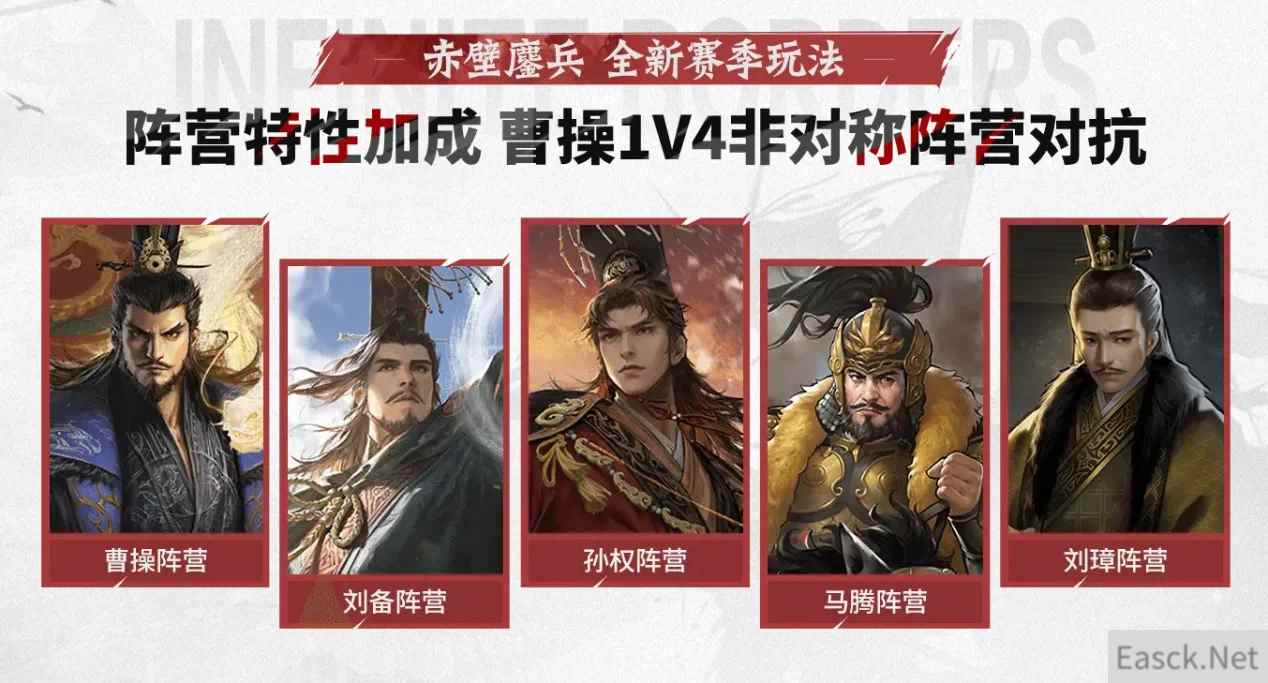 【阵营特性加成 曹操1V4非对称阵营对抗】 在本赛季中,1V4非对称阵营对抗也是一大亮点。跳出孙刘联军抗曹的固有思路,由荆襄之地出发进而着眼于天下格局。因而除了曹刘孙三家,刘璋、马腾等远在西蜀南蛮、关中西凉的阵营也加入到波谲云诡的纷争当中,由此赤壁赛季彻底演变为一场事关天下十三州的全局博弈。
