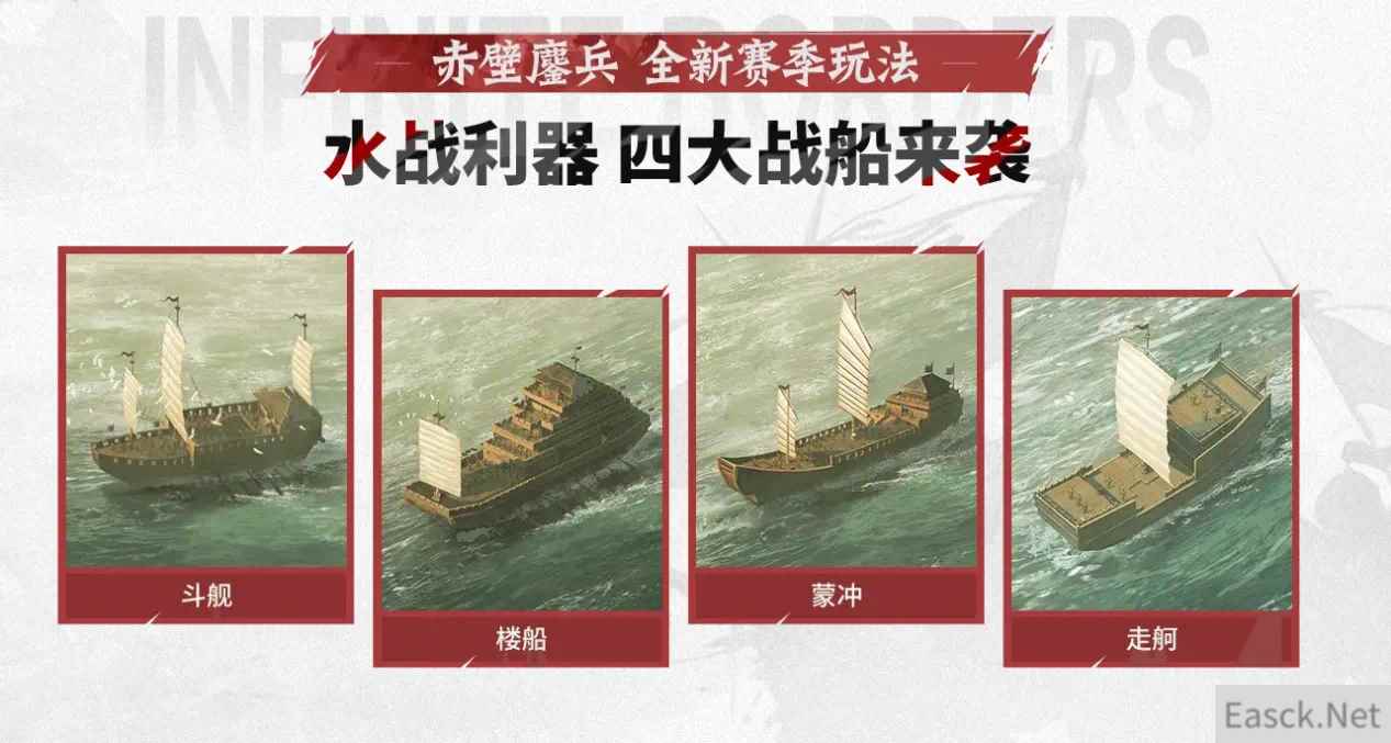 【水战利器 四大战船来袭】 匠心还原了蒙冲、楼船、走舸、斗舰四种历史战船,且不同战船因其船体大小、速度快慢各具特色,或远程攻城,或铁索连环,或灵活穿梭,玩家巧妙编队、择机派遣,便可在战场大有妙用。