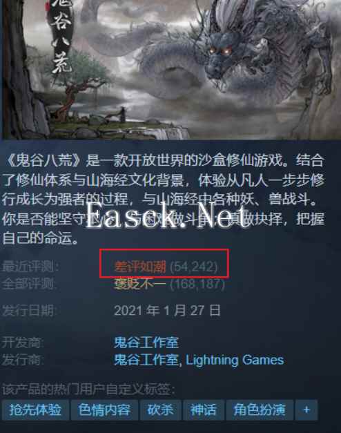 2021年1月,《鬼谷八荒》在Steam上线了EA版。这款以《山海经》为背景创作的国风休闲模拟器游戏,在发布之后备受玩家们的推崇。虽然只是处于测试阶段,人气却一点儿也不差。其热度之高,甚至还吸引了不少外国玩家慕名而来。