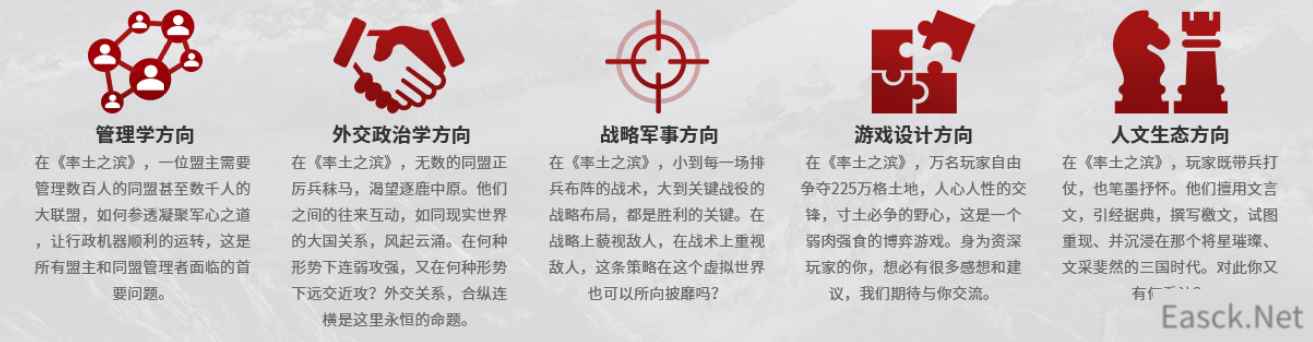 研究主题横跨管理、外交政治、人文生态等多角度 本次论文大赛,参与的大学生只需在体验游戏过后,撰写一篇不少于1500字的《率土之滨》鉴赏论文。官方提供了管理学、外交政治学、战略军事、人文生态等方向供参考,参赛者可基于参考方向延展,也可自行拟定研究角度,来谈谈他们对《率土之滨》游戏人文内涵的理解。