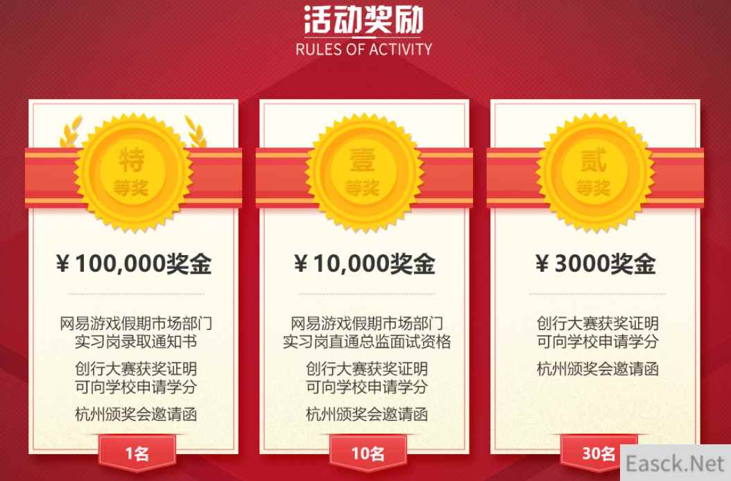参与活动可获学分奖励,最高可获10万现金大奖及网易offer 除了权威的评委阵容,本次大赛的奖励也是十分丰厚,入围大赛第二轮的选手,可获得能用于兑换学分的奖励证书。而斩获特等奖的参赛者,更是能直通网易市场部门实习岗位,并赢取10万元现金大奖。