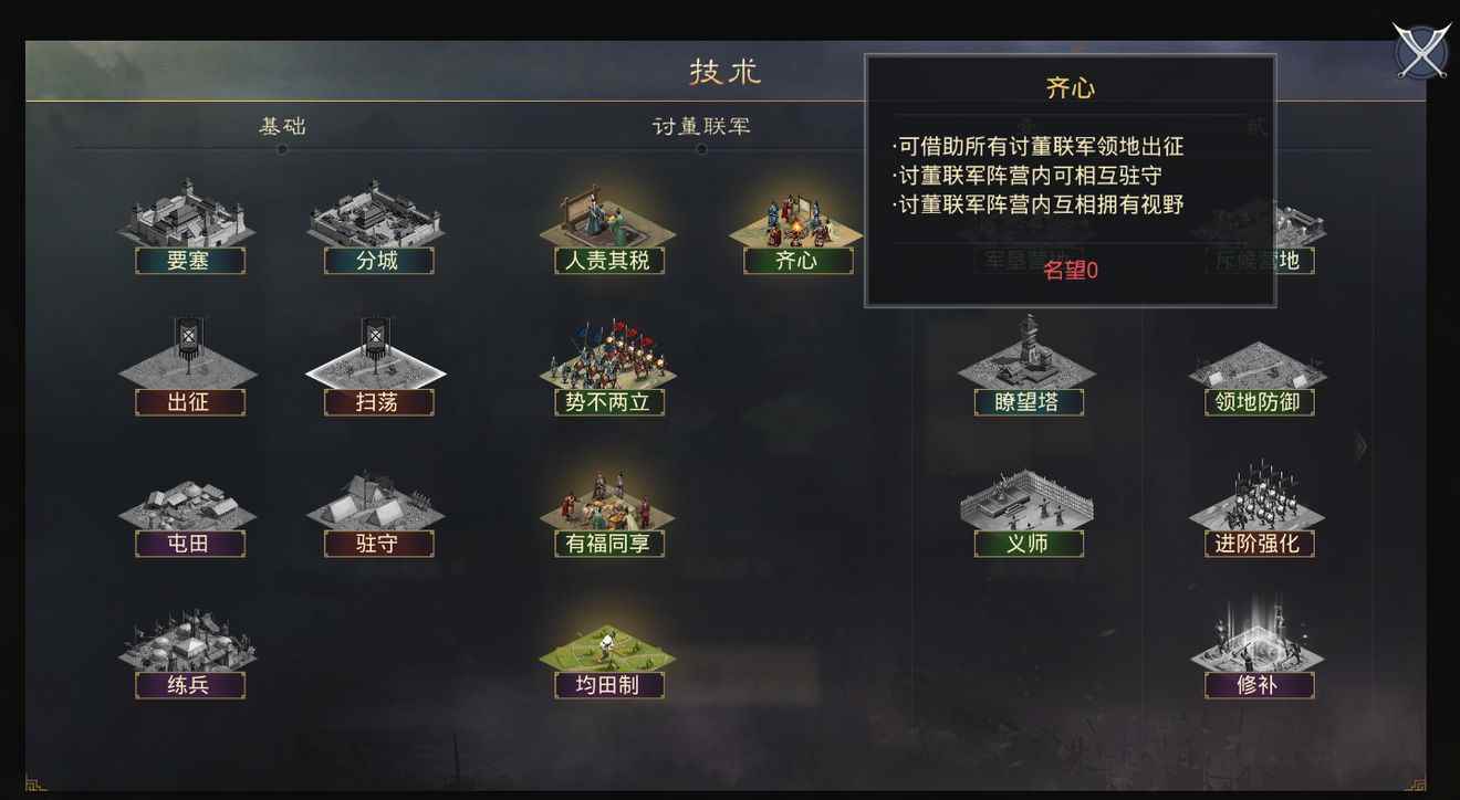 除了常规部队之外,每个军团之中还有一些功能各异的“特种部队”。比如董旻的精弓队擅射,能够对骑兵队伍造成巨大威胁,又如胡轸的铁骑部善于长途奔袭,可谓转进如风,但军心不稳,轻易就会动摇。 在另一个剧本《群雄讨董》中,玩家可以选择挑战董卓或是加入董卓势力。根据阵营选择的不同,玩家还会获得效果各异的阵营技术。董卓军地盘拥挤、发育困难,“封邑”技术能够帮助其在前期获得更多资源;讨董联军实力较弱但人数众多,可以借助“齐心”互相驻守互相支撑。