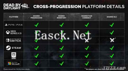 虽然经历了很长时间,但今天《黎明杀机》终于加入了跨平台进程游戏的行列。无论你是在PC, PlayStation, Xbox还是任天堂Switch上玩游戏,只要你在你的Behaviour账户上链接/同步了你的账户,你就可以进行跨平台玩这个游戏。 这里唯一需要注意的是任天堂Switch。虽然你可以通过Switch账户分享你在游戏中的库存和进程,但你不能分享你在其他平台上拥有的任何付费货币或DLC。如上图所示,其他平台没有这些限制。 但是,玩家需注意如果你之前在多个平台上玩过游戏,那么链接你的账户只会保留最高级别的账户。如果你在同一个平台上拥有多个帐号,你就只能将其中一个帐号与你的主机id相关联。如果你碰巧在多个平台上购买了DLC,你将不会得到任何退款。这个同步过程不能撤消,所以还需玩家考虑周全。 |