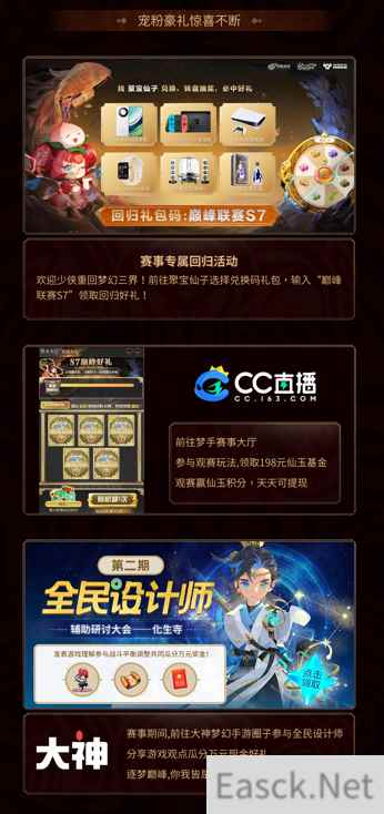 同为赛事生态重要一环,S7赛季季后赛的内容矩阵继续探索电竞泛娱乐化的更多可能性,以多元化的衍生赛事节目深度切入赛事,促进多元内容生态的持续扩张,从而满足不同观众的观赛需求。从聚焦赛前热点的战队前瞻,到捕捉赛场高光时刻的【巅峰TOP5】,再到展示赛事账号与号主风采的【巅峰鉴宝堂】,多款节目以不同维度向观众展示战队及选手的风采,也进一步加强选手们对赛事的参与感与沉浸感。而【声动三界】则通过分享指挥赛中麦克风的亮点时刻,浓缩赛场趣味花絮等泛娱乐内容,提供更具差异化与趣味化的内容。 伴随着巅峰联赛S7踏入最后的征程,线上观赛也迎来了焕新特权,宠粉豪礼惊喜不断,为赛事助燃更火热的气氛!前往游戏内参与比赛竞猜助威,即可兑换稀有永久足迹、紫色星辰晶石、高级变身卡等好礼!前往聚宝仙子选择兑换码礼包,输入“巅峰联赛S7”即可领取回归好礼!前往CC直播《梦幻西游》手游赛事大厅,参与观赛玩法为战队助威,即有机会领取198元的仙玉基金!通过积累观赛时长赢取仙玉积分,更有现金奖励天天可提现!而前往网易大神APP《梦幻西游》手游圈子参与“全民设计师”活动,在辅助研讨大会中分享对化生寺的游戏理解,参与战斗平衡调整,向巅峰联赛注入创意与热情,即可共同瓜分万元的现金豪礼!