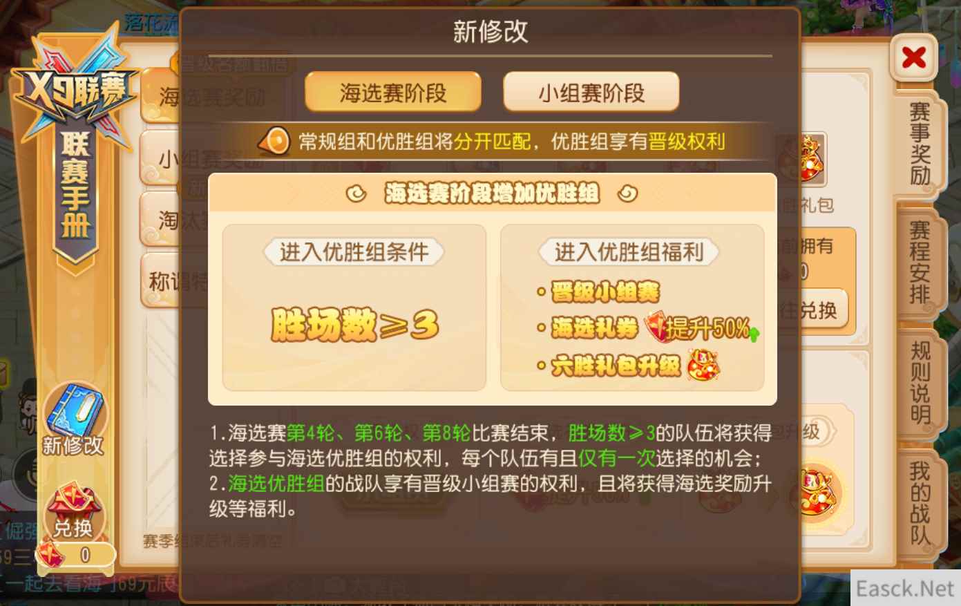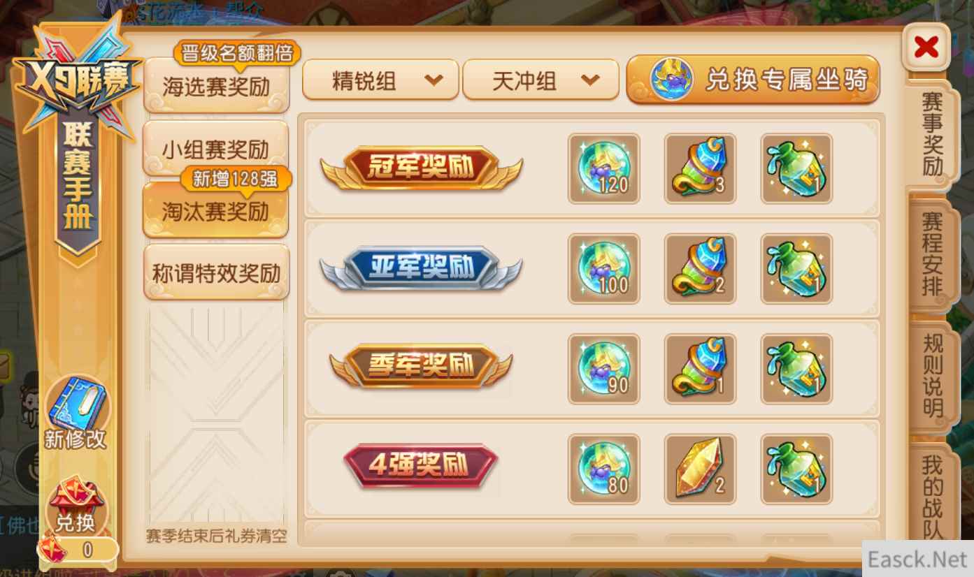 奖励全面提升,参赛回报加码! 在奖励方面,除原有的海选赛首战、两胜、四胜外,海选赛优胜组的六胜礼包将更加丰厚,包括如意锦囊、淬灵露、宝石锤、法宝精华礼包等,且海选奖券也将提升50%! 而淘汰赛天冲组16强、32强、64强奖励也得到全面提升,并新增128强奖励,包括洗炼石、超级淬灵露、开明兽灵珠、战斧队标、特效称谓、X9联赛坐骑等在内的丰厚奖励!