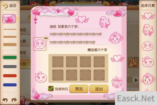 以礼传情,满满心意献予君 在新增的礼物系统中,玩家不仅可以直接通过花费仙玉将商城道具赠送给游戏好友,还可以自己动手设计独一无二的礼包和卡纸作为道具装饰,让礼物看起来更加美观动人。在包装的过程中,玩家可以自己选择礼包的颜色和花纹,或选择自己所喜的颜色,或挑中赠送对象所爱的花纹,满满心意尽皆于细微中得到体现;而在设计卡纸的过程中,除了可以选择卡纸的边框花纹外,玩家还能随心增添超级泡泡、超级神鸡、超级神猴等可爱形象于其上,并附上几句想要对赠送对象表达的话,让收礼者感受到你的浓浓情谊。