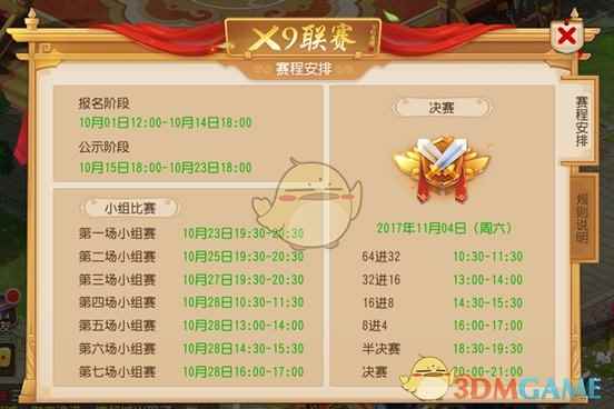 环环相扣,精彩纷呈扣人心弦 根据赛程安排,本届《梦幻西游》手游X9联赛的报名时间为10月1日-14日,因此,还未报名参赛的玩家可以抓紧时间,组建战队加入其中;10月15日-23日则为公示阶段;而后,在10月23日、25日、27日和28日,七场小组赛将为你呈现连番好戏;成功闯关小组赛的64支战队,将在11月4日当天,展开64进32、32进16、16进8、8进4以及半决赛和决赛的激烈角逐,向着所在等级段组别的冠军荣耀发起强有力的冲击。如此合理有序的赛程安排,必将让每一位喜爱《梦幻西游》手游PVP竞技的玩家都享受到高端竞技的极致魅力和乐趣。