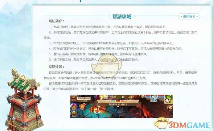 点燃激情!帮派攻城蓄势待发 帮派攻城,是《梦幻西游》手游帮战的全新玩法。春秋战国时期,越国铸剑大师欧冶子曾经留下了一本《龙泉谱》和一尊铸剑炉。随着时间的推移,铸剑炉中形成了炉灵,守护着炉灰中的《龙泉谱》。 在每轮帮派竞赛双周的周四晚上20:30~22:00。玩家只要身处入围帮战的帮派中并担纲帮派正式成员,且等级≥50,入帮时间≥2天,即可帮助帮派参与争夺《龙泉谱》,并为自己的帮派赢得“天下第一帮”的荣誉。而只有在规定时间内消耗对手足够多的城门耐久度,才能够战胜对手,赢得胜利!