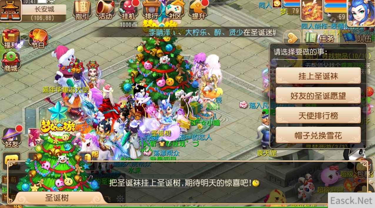 圣诞礼袜:写下祝福梦想成真 挂圣诞袜,一直以来都是圣诞节的一大传统。在活动期间,活跃度达到60的少侠也可以前往长安的圣诞树上,将神秘圣诞袜挂到圣诞树上,同时进行许愿。在此过程中,少侠可以通过积累天使值,获取丰厚好礼,冲击天使排行榜。在第二天少侠更可以到圣诞树上摘下圣诞袜,也许在此过程中,圣诞老人就会实现玩家的愿望哦! 除了许愿之外,少侠也可以通过圣诞树,查看好友的圣诞愿望,为了他们送上一份属意的圣诞好礼!