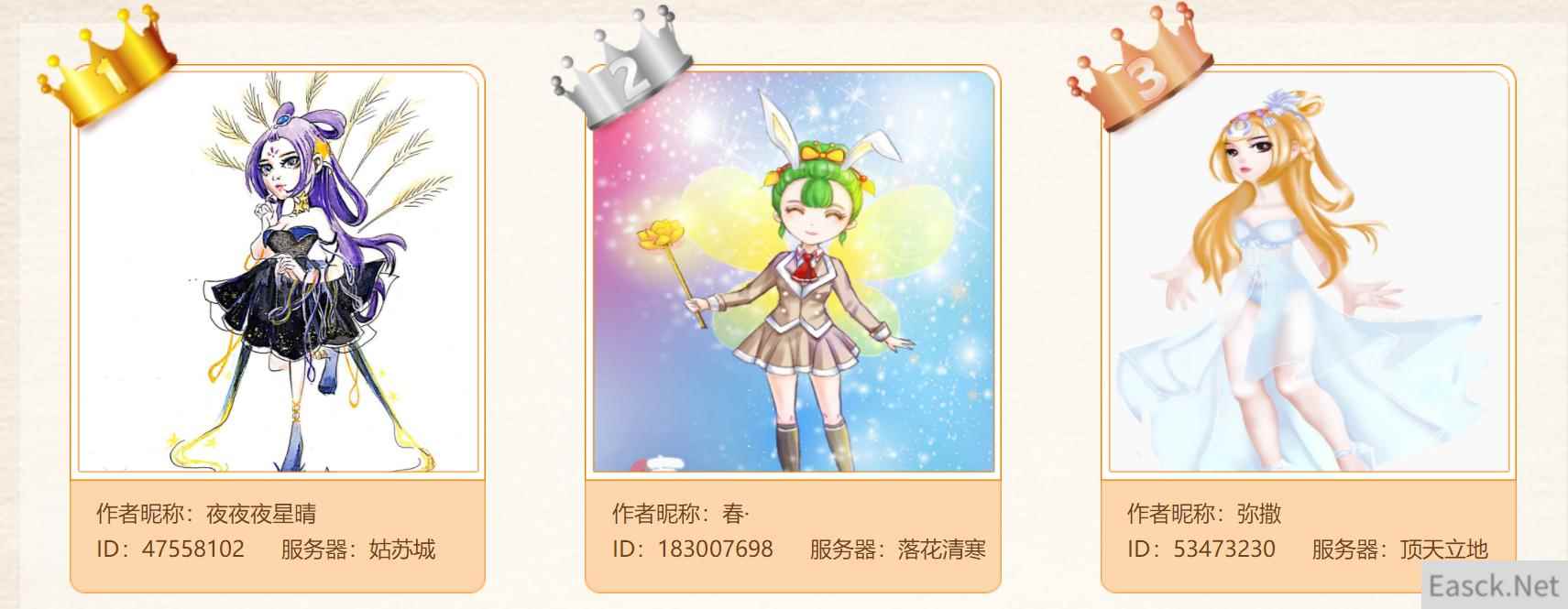 自3月21日开启报名阶段以来,不少玩家就纷纷发挥创意灵感,融合自身对时尚理念的理解,创作出各具特色的时装,街头运动风、复古旗袍风、夏日清凉风、清新学院风......琳琅满目的华丽时装,令玩家群体产生满满的喜爱之情。不少玩家除了对自身所钟意的作品进行点赞、评论和送花外,还自发地在游戏内各大频道为作品进行宣传推广,期望能够为其争取到尽可能多地分数。随着4月20日的到来,本届时装设计大赛正式落下帷幕,在玩家群体和官方评审团的双重遴选下,获得作品最佳人气奖的10名玩家和获得作品最具设计感奖的5名玩家也最终诞生。 作品赏析,华服锦衣面面观 此番,获得最佳人气作品前三名的玩家依次是来自姑苏城的“夜夜夜星晴”、落花清寒的“春·”和顶天立地的“弥撒”。其中,玩家夜夜夜星晴所设计的是“浩瀚星空礼服”,深黑色主色调搭配点缀上方的点点星光,再结合飘逸的裙摆和环绕的丝带,整体看来优雅而华贵;玩家春·设计的是小清新的学院服,正装小短裙,浓浓英式风,将玄彩娥俏皮可爱的一面展现得淋漓尽致;玩家弥撒则融合季节特性,创作出清凉薄纱裙,唯美的白色系,薄而飘的裙面,让梦灵珑更显仙气十足。