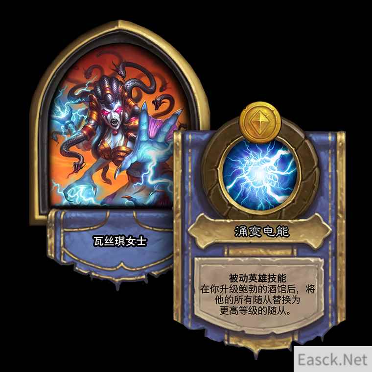 新英雄 这三位新英雄将于5月27日正式解锁,拥有战棋礼遇的玩家可以立即抢先体验。 瓦丝琪女士 涌变电能 [被动]:在你升级鲍勃的酒馆后,将他的所有随从替换为更高等级的随从。
