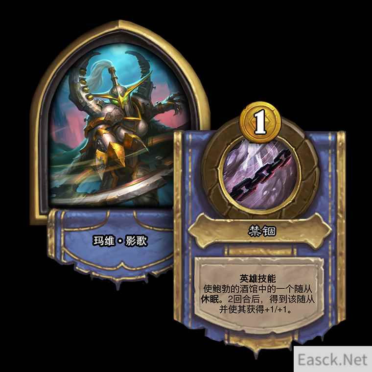 玛维·影歌 禁锢 [消耗1枚铸币]:使鲍勃的酒馆中的一个随从休眠。2回合后,得到该随从并使其获得+1/+1。