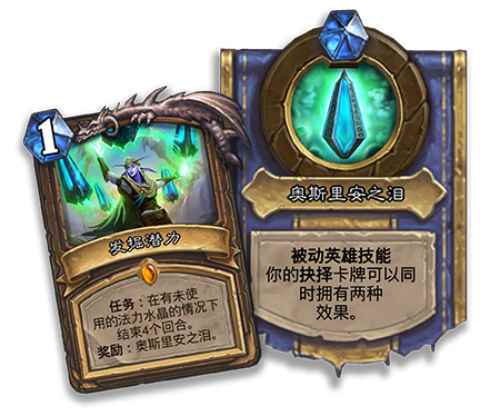 每一个进入沙漠的探险者都需要有一个明确的任务,在“奥丹姆奇兵”中,九大职业都会拥有全新的传说任务卡牌。一旦完成这些任务,就能获得足以改变局势的英雄技能。和已有的任务卡牌相同,这些法力值消耗为(1)点的传说卡牌会出现在你的起始手牌中,使用任务卡牌后,任务进度会显示在你的英雄头像上方。不过,与之前的任务牌不同的是,奥丹姆的任务牌奖励会在你完成任务目标后立刻生效。