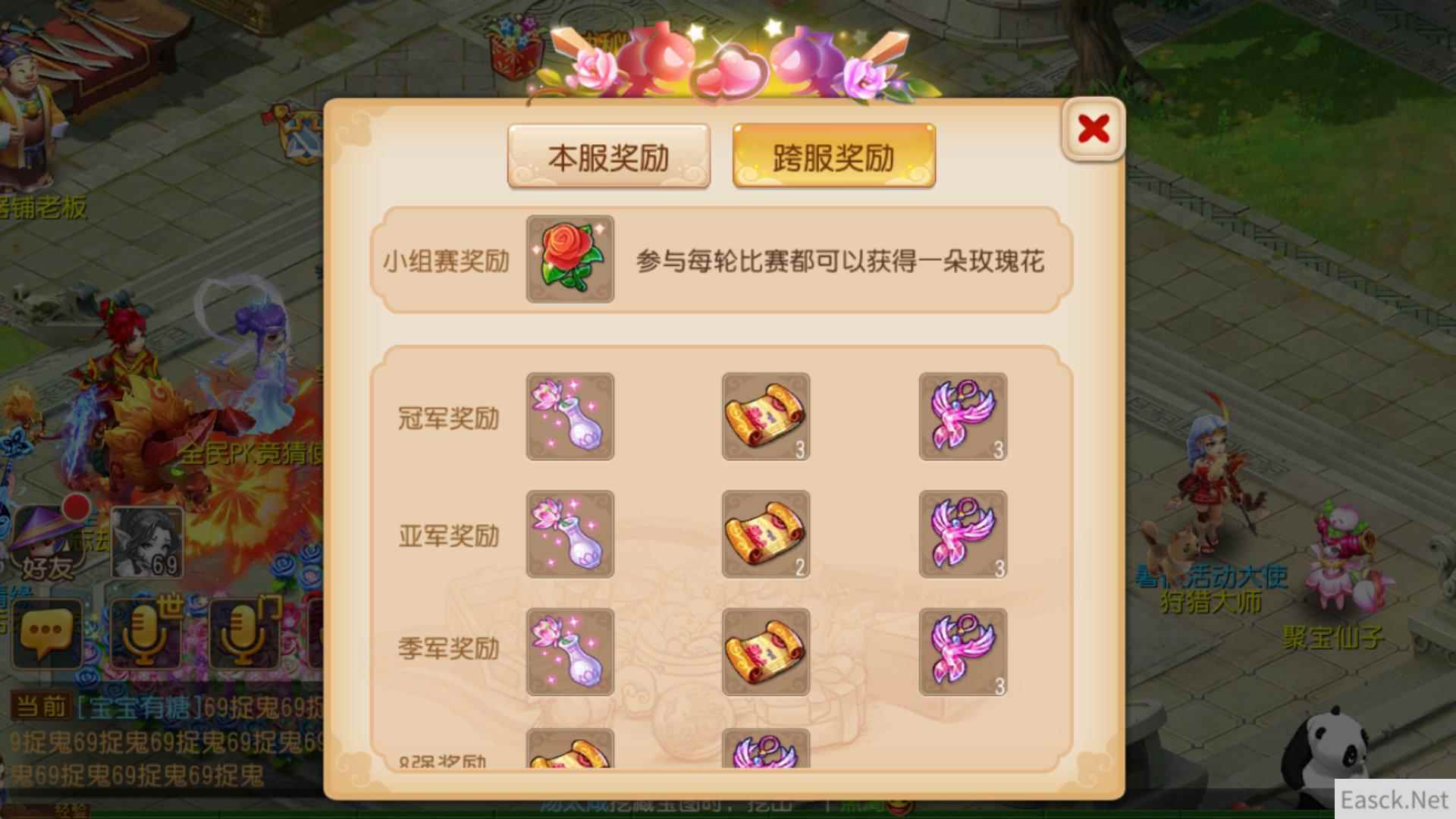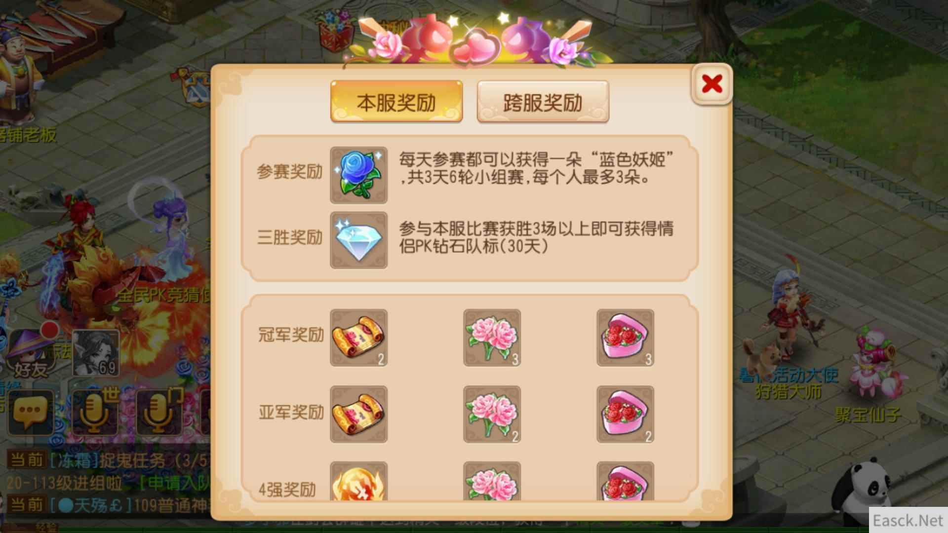 跨服阶段: ①【参赛奖励】每结束一场跨服战斗,可获得一朵玫瑰花奖励,6场比赛可得6朵。 ②【称谓奖励】跻身淘汰赛的各组别32强,可获得情侣PK大赛专属称谓; ③【名次奖励】根据最终排名,组别1-32名还能够收获不同数量的比翼双飞、高级兽诀、千叶莲露奖励。