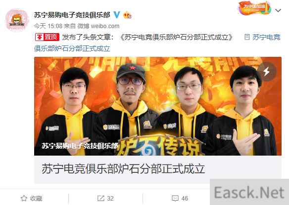 苏宁电竞俱乐部炉石分部正式成立 阵容堪称豪华