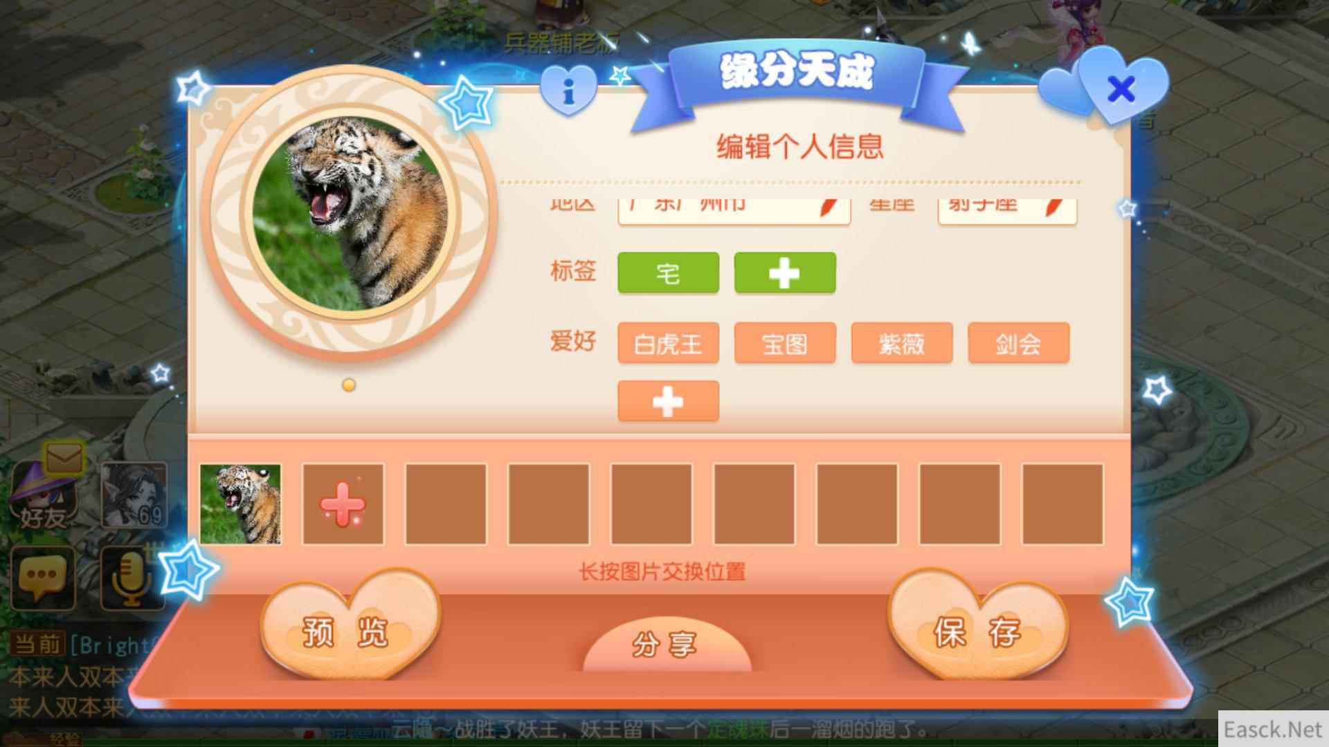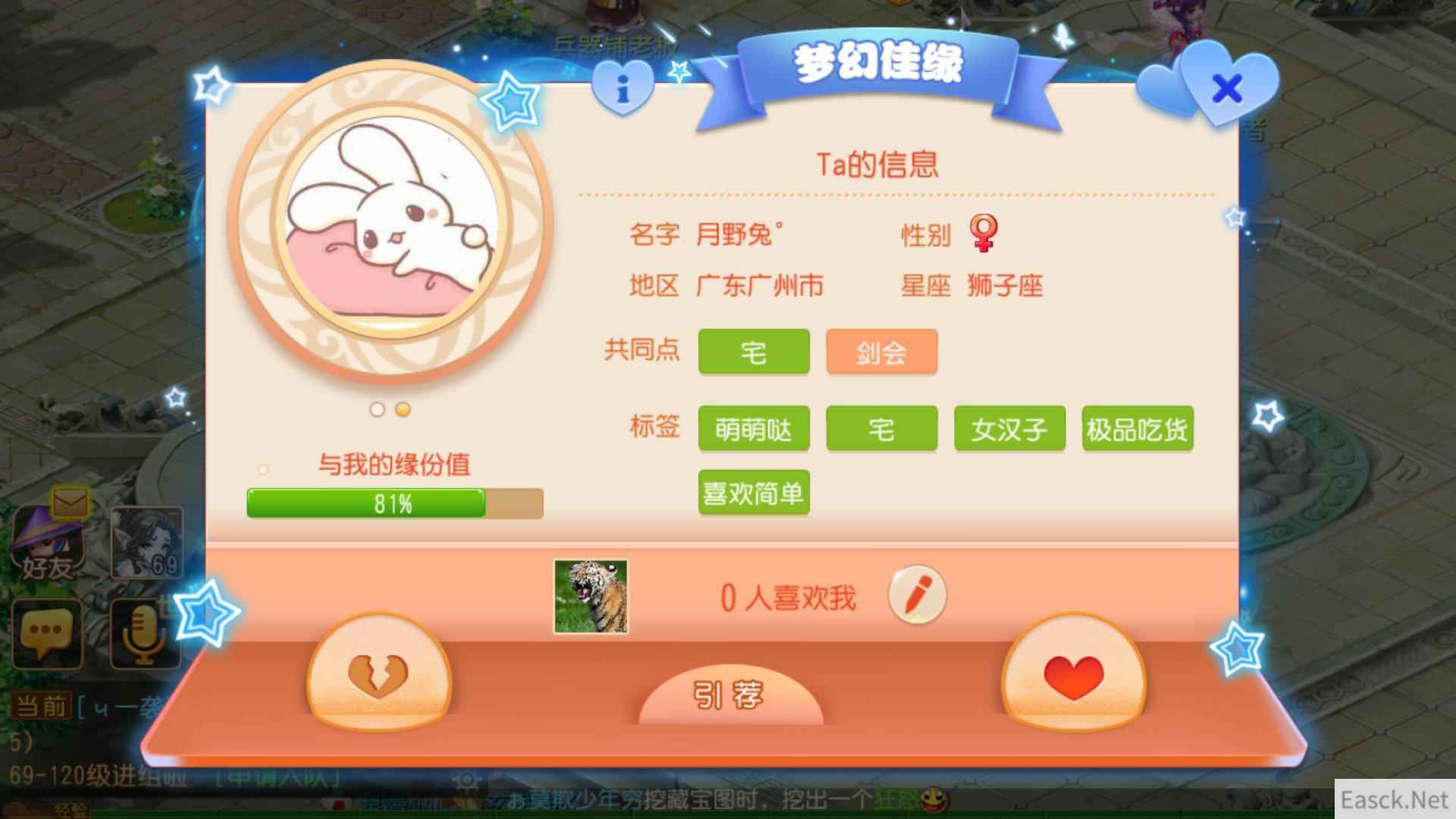 在获得“星语情缘”测试结果后,玩家可在缘分天成大使处设置自己的“魅力界面”,编辑好所在地、星座、标签和爱好、照片等个人信息,而后进入“梦幻佳缘”界面,即可查看其它玩家的相关信息,以及彼此间的缘分匹配值。