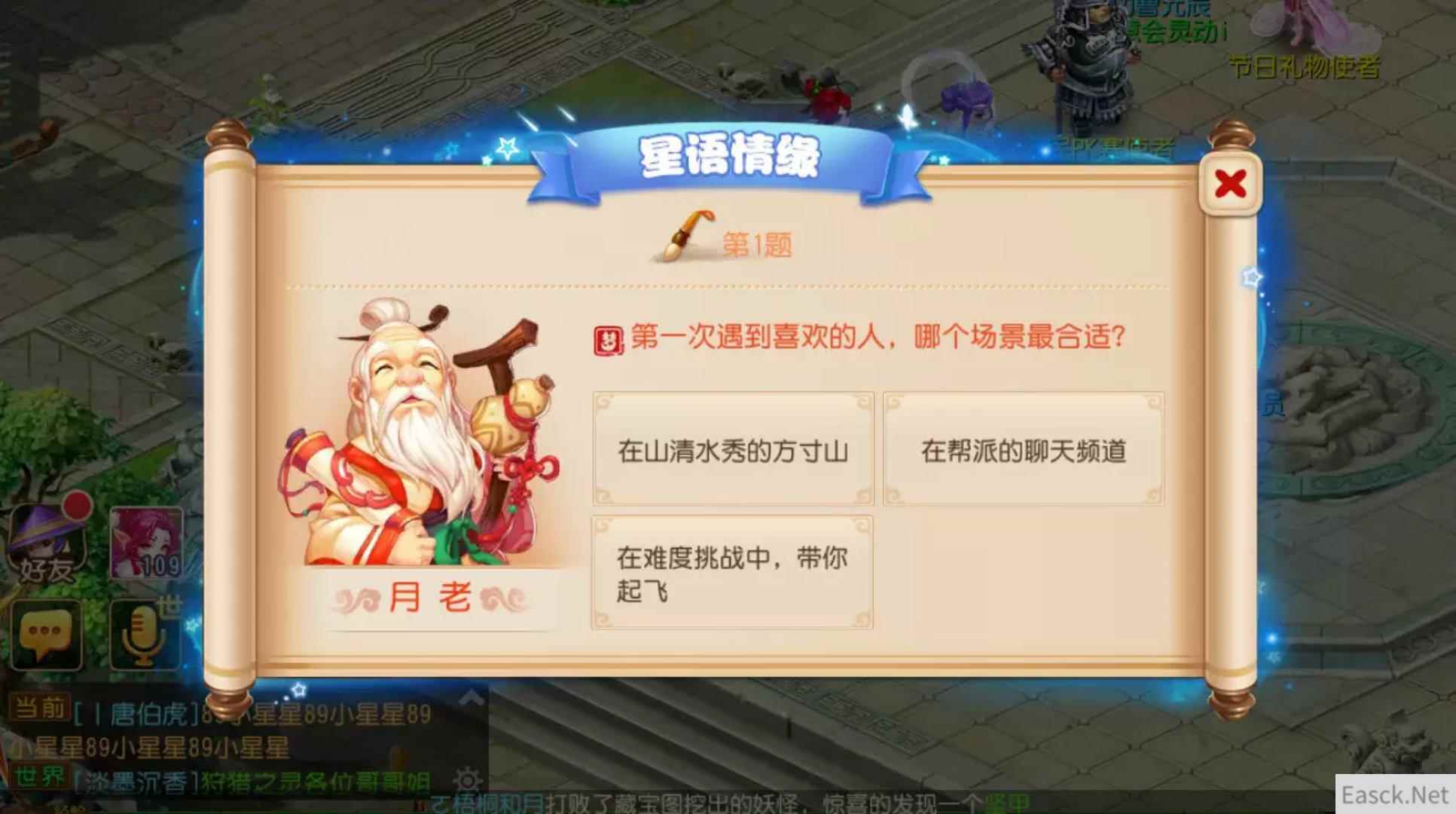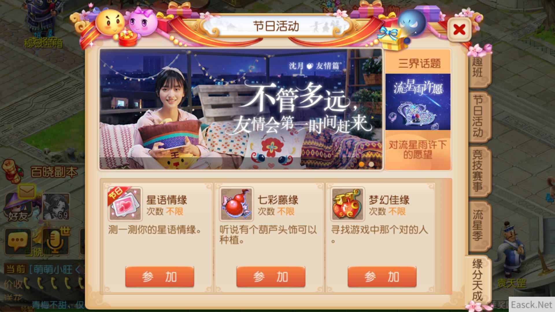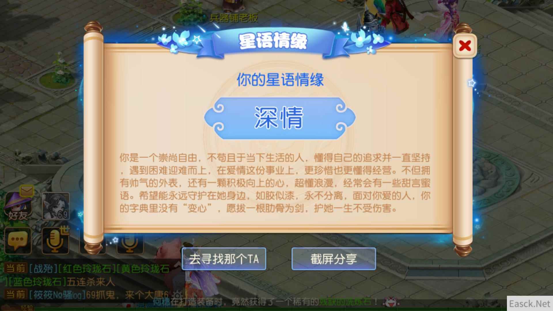 8月2日起至8月21日,想要测试自己属于哪种情感性格类型的玩家,可到长安城(73,88)缘分天成大使处,参与“星语情缘”活动,在回答完月老所提的问题后,他将会根据你所提供的答案,综合判断出你的星语情缘,比如有的玩家是“热情”,有的玩家则是“深情”。需要注意的是,星语情缘活动仅能参与1次,因此玩家需要认真作答哦!