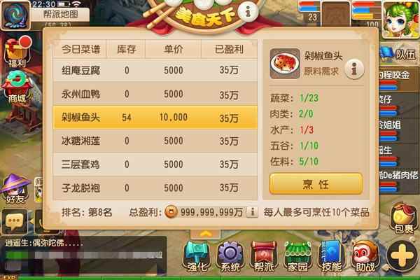 作为帮派的统筹者,帮主要提前在非活动时间设置好帮派菜谱,以便光临的食客根据菜谱点菜。而帮众则需要分工合作,帮助庖丁完成食客所点的菜肴。其中,擅长跑动沟通的帮众,可与蔬菜、屠夫、渔夫和农夫NPC对话,获得所需食材;对于烹饪中不可或缺的佐料,则需通过回答帮派聊天界面中系统提出的问题来获取,答对的成员越多,佐料就会越丰富哦!而喜好下厨烹饪的帮众,则可主动点击食客查看其所点菜肴,而后进入帮派美食菜单中进行烹饪制作,满足食客的味蕾。