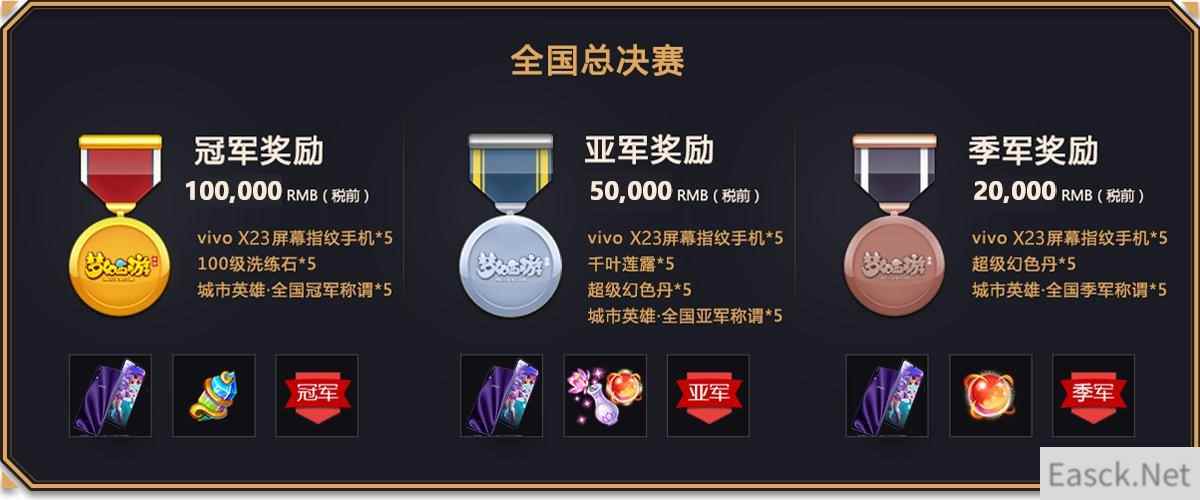 全国总决赛阶段,则将采用“双败制”的形式,分别决出全国冠、亚、季军。所谓双败制,也即失败两场才会淘汰出局。8支大区赛晋级队伍将随机分配两两对阵,获胜的四支队伍继续两两较量,直至决出胜者组冠军;落败战队则先后转移到败者组展开对决,再次落败1场就会淘汰,直至决出败者组冠军。最终,胜者组冠军和败者组冠军进行巅峰对决,获胜一方就将荣登全国总冠军的宝座。 期待满满,惊喜豪礼花落谁家 为了鼓励在本届城市英雄争霸赛上拥有优异表现的战队,《梦幻西游》手游此番也精心准备了丰厚的豪礼相送。其中,全国总冠军将赢取vivo X23屏幕指纹手机、100级洗炼石和税前10万元现金,亚军可把vivo X23屏幕指纹手机、千叶莲露、超级幻色丹和税前5万元现金收归囊中,季军则将喜获vivo X23屏幕指纹手机、超级幻色丹和税前2万元现金。