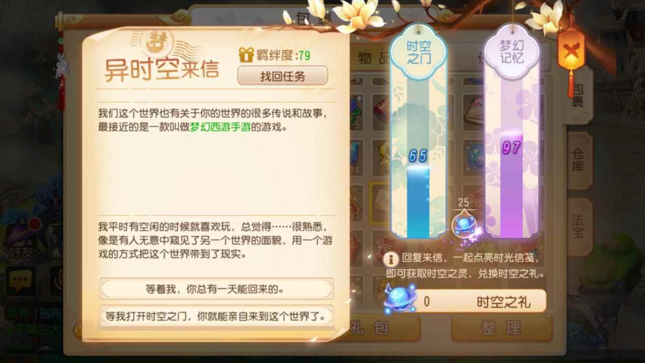 时空来信,梦回唐朝寻初忆 在9月30日,三界全体玩家都接收到一则神秘的来信预告,一封来自异时空的匿名信,正跨越时空洪流而来,并会在10月5日送达每一位玩家手中。而在收到来信后,经过几天的信件往返交流,不少玩家对这位神秘寄信者已经有了些许的认知和了解:其生活在21世纪,是一名90后艺人,喜好画羊、唱歌和跳舞,近日时常梦到自己在神秘仙人的教导下修习术法......,那么,为何会有这样一场异时空交流呢?