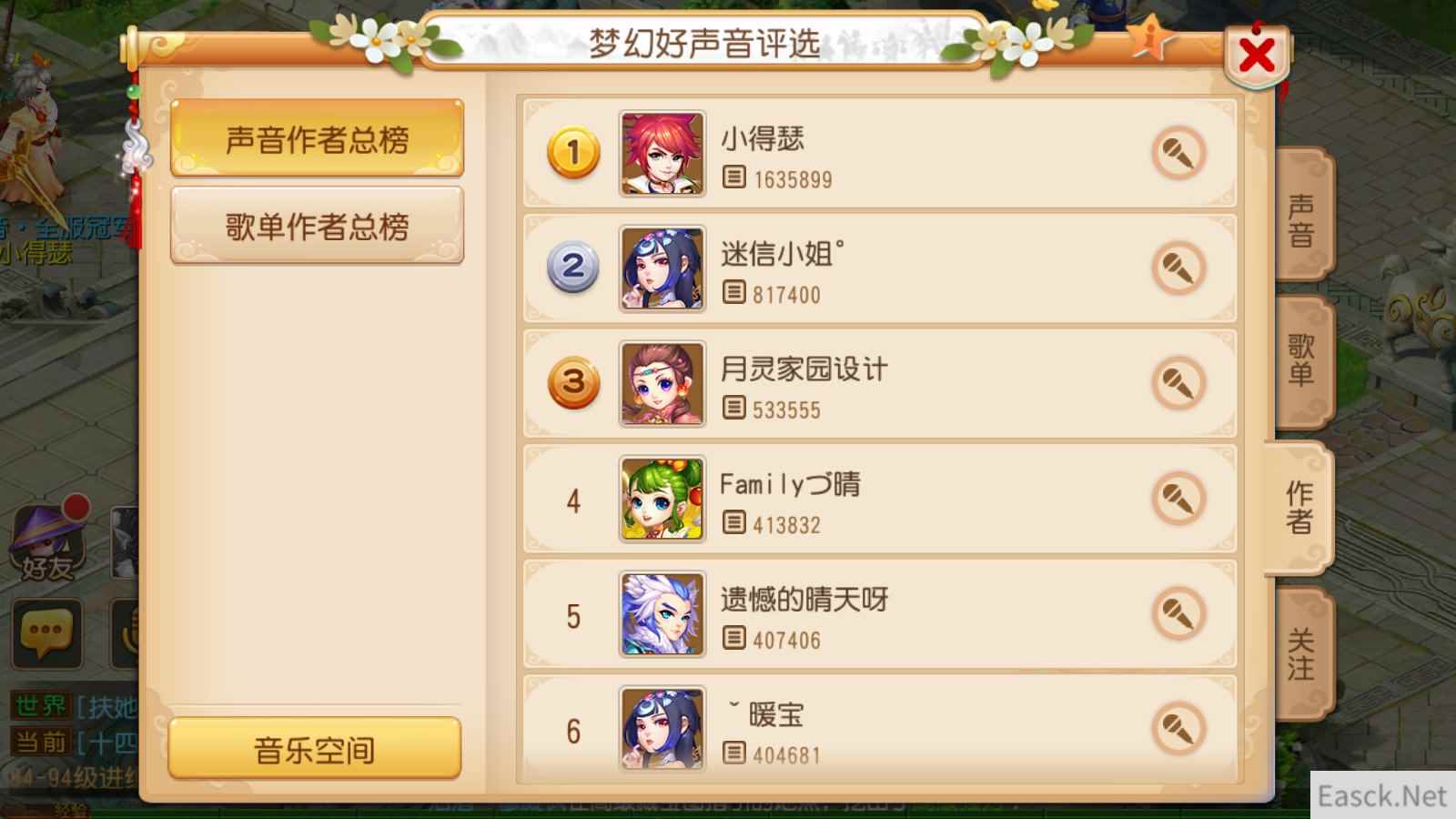 圆满落幕!20万参赛作品诠释梦幻好声音 《梦幻西游》手游梦幻好声音活动已经正式落下帷幕,在过去的三周时间里,梦幻好声音活动收到了超过20万参赛作品。无数玩家围绕着三大周主题,抒发情怀,将自己喜爱的好声音推荐给更多玩家。 现在,梦幻好声音活动结果已经正式公布,来自八仙过海服务器的小得瑟以超过163万欣赏值位列声音作者总榜第一,他将与其余获得声音作者总榜前十的玩家一起,受邀前往上海,参与张艺兴见面会。而获得声音作者总榜前100名的玩家以及歌单作者总榜前50名的玩家,也将根据成绩获得特殊称谓、个性图标、好声音空间秀、好声音感恩礼、超级幻色丹、高级藏宝图、宝石锤、精选高级内丹礼包、长安城雕像特权、千叶莲露、神兽超级神犬等好礼,为自己的参赛之旅留下一段最美回忆!