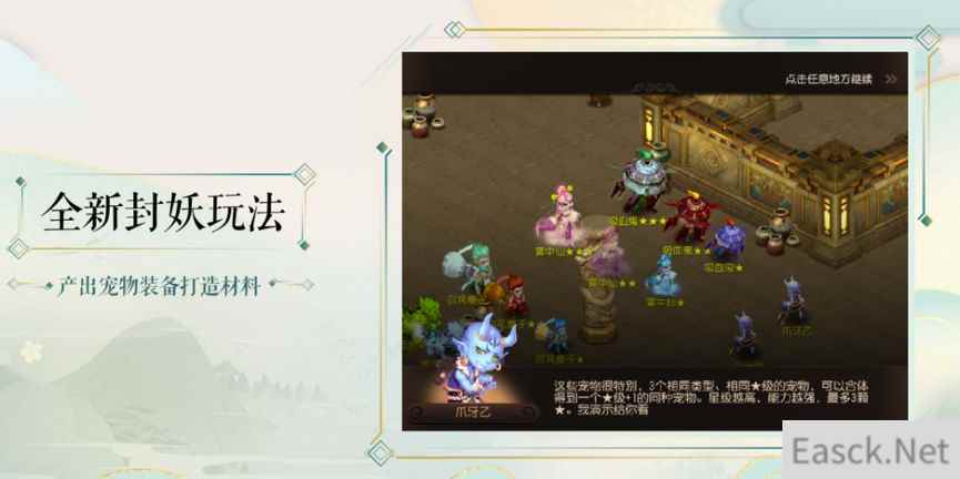 封妖升级,呼朋唤友平定三界 在宠物装备到来同时,封妖玩法也将迎来全面升级。新的封妖玩法将转变为每周的副本组队任务,玩家在领取任务后,将和小伙伴一起传送入副本,通过单人和组队战队,获取包括高品质天眼石在内的丰厚奖励。高品质天眼石能帮助玩家有更大概率打造出极品宠物装备,助力玩家的宠物实力更上一层楼!