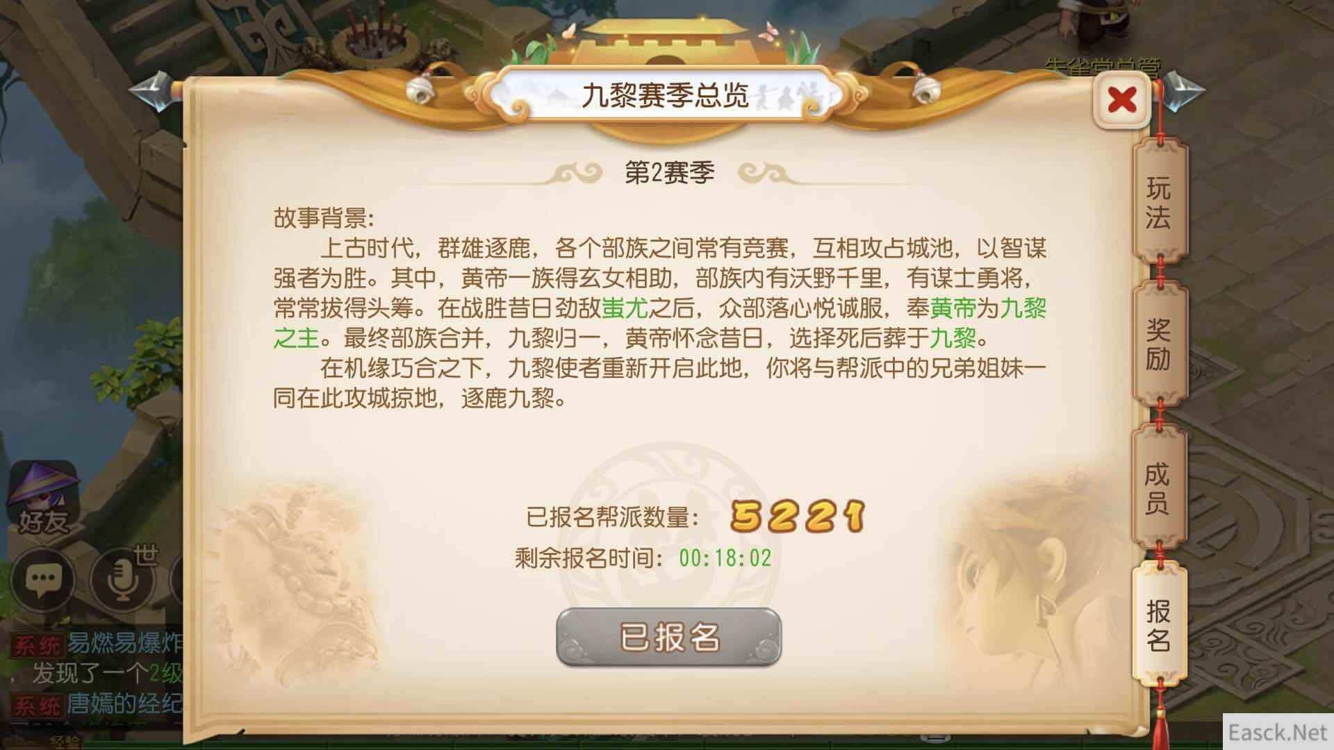 赢到最后!谁是九黎之墟第二赛季王者? 在赛季结束后,系统将根据每个帮派所得的帮派得分进行排名并结算奖励。而帮派得分主要由帮派所占领的主城和土地构成。其中主城分=主城等级*10,土地分=土地等级*1。因此,实力强大的帮派在享受帮派对战快感的同时,也不应忘记齐心协力占据更多土地。而实力相对比较薄弱的帮派,也可以通过策略以及外交,扩大自己的影响力,战到最后。 不到最后一刻,鹿死谁手,难见分晓!