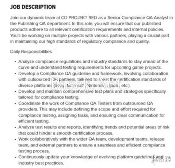 CD Projekt Red 公司在一份高级合规 QA 分析师的招聘启事中提到了任天堂游戏机。招聘要求描述了需要其即将推出的游戏 "满足不同平台(索尼、微软、任天堂、苹果等)的认证标准"。这可能表明,CD Projekt Red 的下一款游戏,如 "北极星 "和 "猎户座计划",正在考虑采用新的平台,例如任天堂 Switch 的后续版本。Switch 也有可能被考虑移植某些游戏,但根据 CD Projekt Red 下一款游戏的时间框架,以及《赛博朋克2077》在上一代硬件上的挣扎,这种可能性并不大。