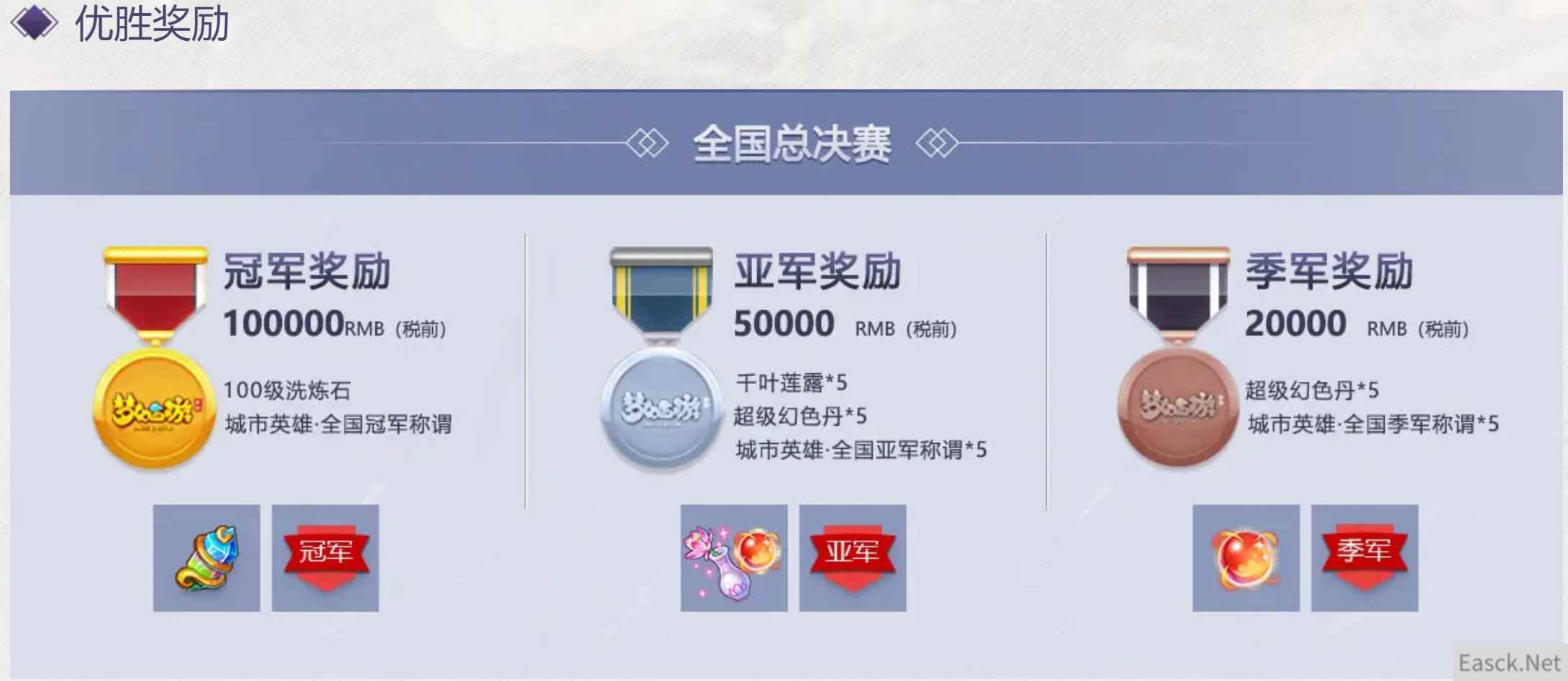 铭刻荣耀,十万人民币大奖花落谁家 为了感谢玩家对本届城市英雄争霸赛的支持,《梦幻西游》手游为参赛玩家也准备了丰厚好礼。 成功报名并于现场参与海选赛的玩家,将获得城市英雄争霸赛限量队标棒棒糖一个。在海选赛中获得冠军荣耀的战队则将赢取1500人民币奖励。 在城市赛阶段,冠军战队更将夺得15000人民币奖励、100级书铁套*5、高级魔兽要诀*10、城市赛冠军称谓*5等线上线下好礼。 进入全国总决赛阶段,冠军战队成员除了能获得100级洗炼石和城市英雄·全国冠军称谓外,还能额外瓜分10万人民币现金大奖!丰富的线上线下大奖,相信一定能让所有参赛玩家全力以赴,向最终的冠军发起冲击!