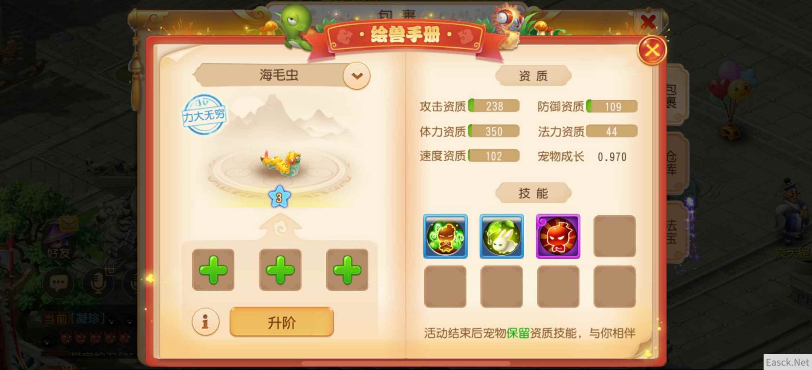 绘兽手册,日积月累梦想成真 在3月19日~4月3日,等级≥40级的玩家还将获得一本绘兽手册。只要在活动期间,玩家根据线索,将特定的绘制图案画在封印上,即可获得大海龟或海毛虫。 接下来,玩家还可以通过完成对应日常任务,解锁培养材料,将其进行培养升星,使其获得更高的资质和更多的技能。在活动结束后,这些萌宠就将成为玩家真正的宠物,并为玩家送上一份神秘大礼!