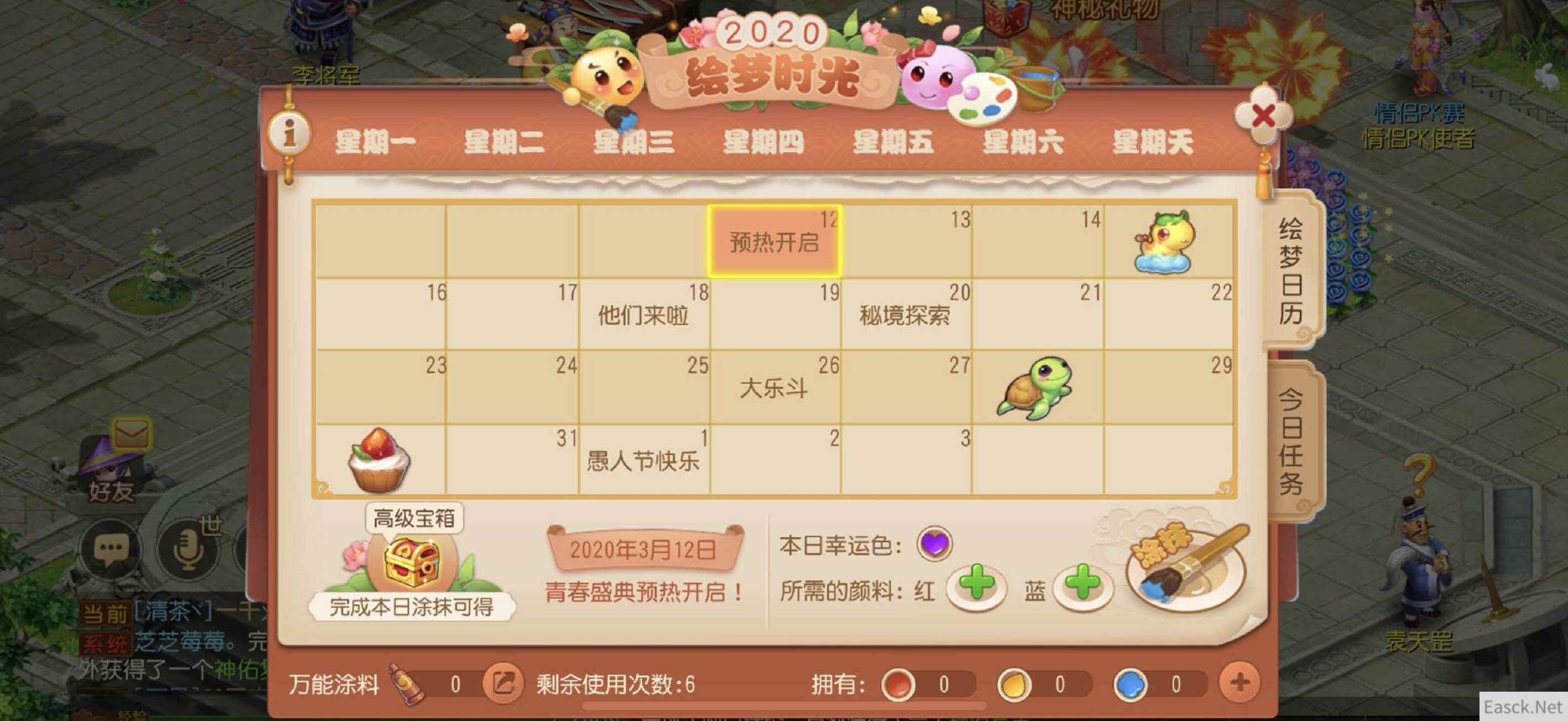 绘梦时光,染尽美好岁月 你是否还记得自己与大海龟、海毛虫相伴的日子呢?现在,他们已经回归三界,带领每一位玩家重温美好。 从3月12日12:00开始,玩家可以打开时光绘本,领取每日的红、黄、蓝三种颜料任务,以此获得对应涂料,再使用涂料,填出正确颜色,解锁丰厚奖励。如果玩家能够在活动期间完成全部颜色填图,更能解锁神秘大礼!