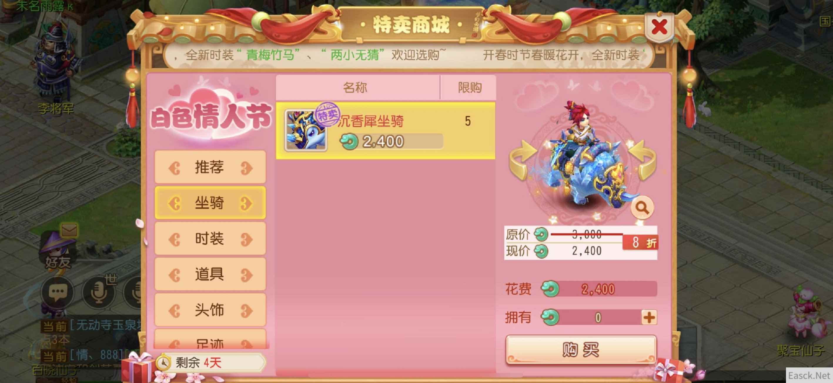 特卖开启,新坐骑新时装甜蜜上新 在白色情人节活动开启之时,《梦幻西游》手游节日特卖商城也同步上线。在此次特卖商城中,全新单人坐骑沉香犀和新时装青梅竹马(男)、两小无猜(女)以及“粉喵喵&蓝喵喵”情侣主题冒泡框、头像框、足迹、贺卡甜蜜上线。 对于想要将“粉喵喵&蓝喵喵”系列道具收入怀中的玩家,游戏商城还特别推出了喵不可言礼盒,为玩家打包惊喜。玩家还能将礼盒中的礼物赠送给自己好友,以感谢他们过去一年对自己的关怀。