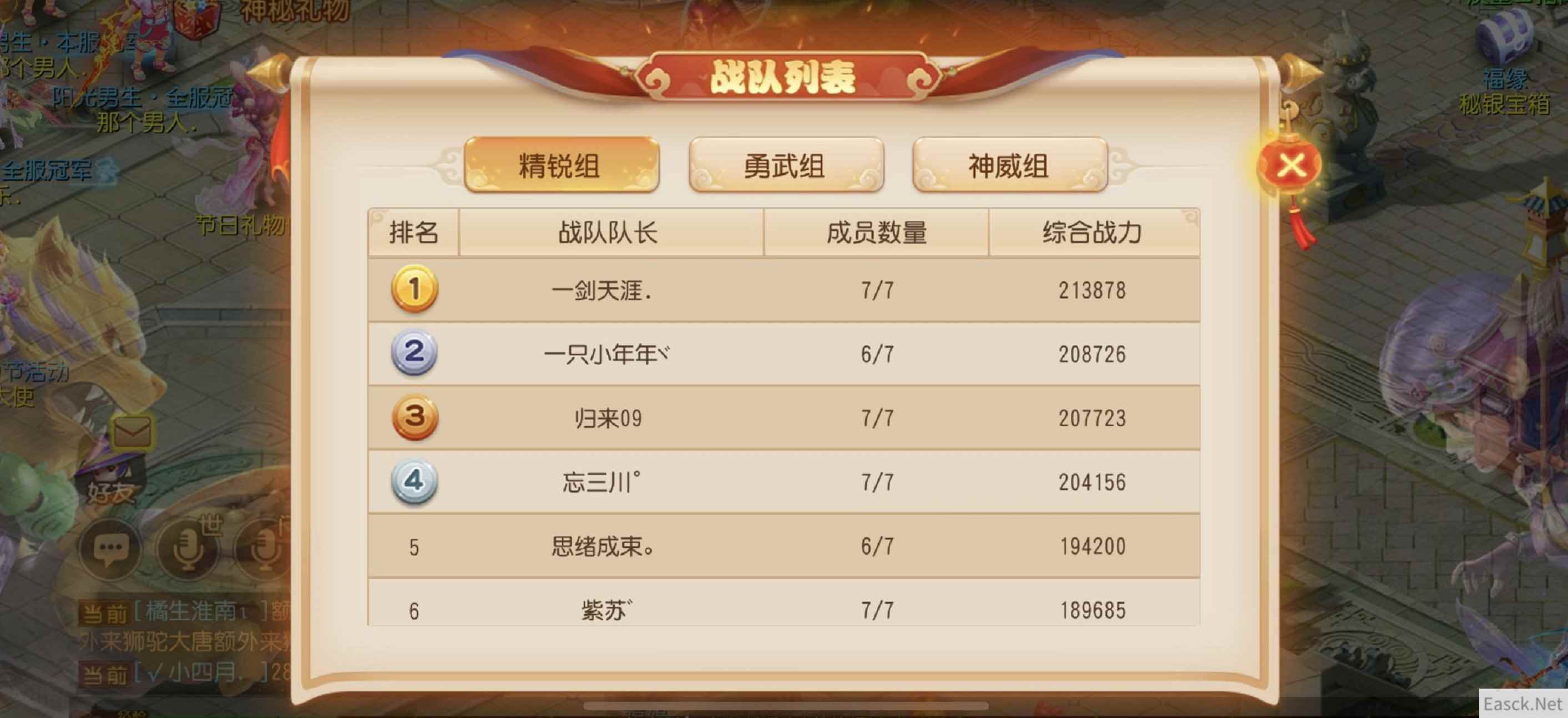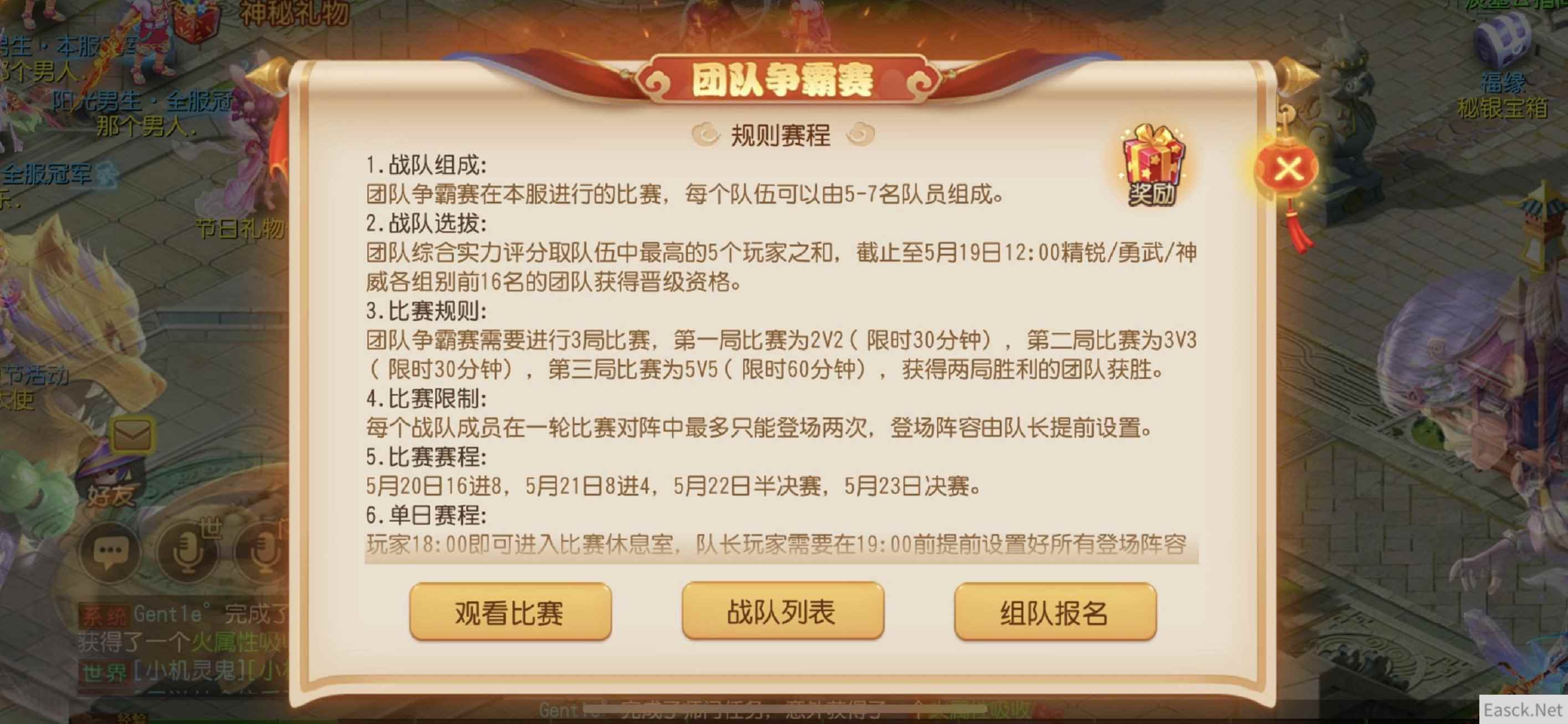 一战方休,群雄争霸勇夺冠军 团队争霸赛,是《梦幻西游》手游最新团队赛事。在报名期间,玩家可以以5~7人为一组,前往长安城团队争霸赛使者处报名参赛。在报名截止后,系统会根据玩家等级,将玩家队伍分入精锐、勇武、神威三大组别中,然后将团队中综合实力评分最强的5个玩家的积分相加为团队积分。届时,在三大组别中积分排名前16名的战队将自动获得参赛资格,于5月20日正式打响战斗! 注意:玩家现在即可在团队争霸赛使者处,了解现在已经报名参赛的战队战力,以组建合适的阵容,保证自己的团队能顺利获得参赛资格。