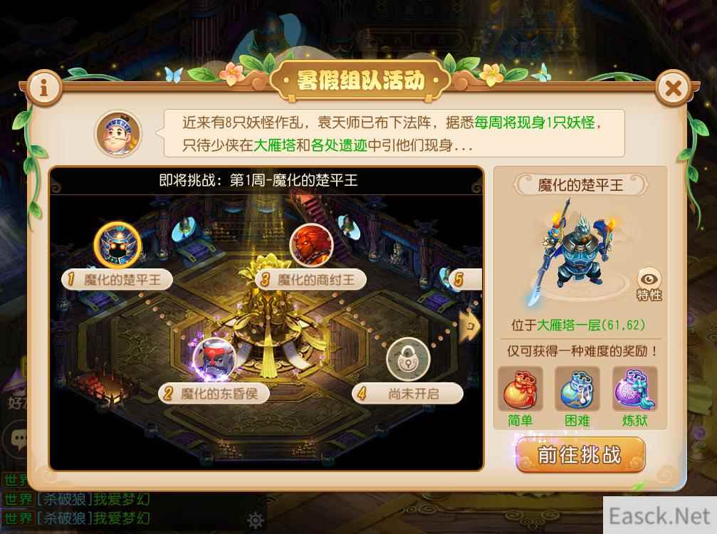 组队难度挑战:平定魔物,就在此时 在暑期活动开启同时,《梦幻西游》手游还将推出史上最强难度挑战活动。在活动期间的每周五,等级≥65级的玩家可以3~5人组队,去挑战不同地图中不同难度的魔化怪分身。 玩家可以通过挑战更高难度的魔化怪分身,以解锁更丰厚奖励,击杀十成功力难度魔化怪,更有机会获得金刚石、定魂珠、法宝精华等高价值奖励哦!