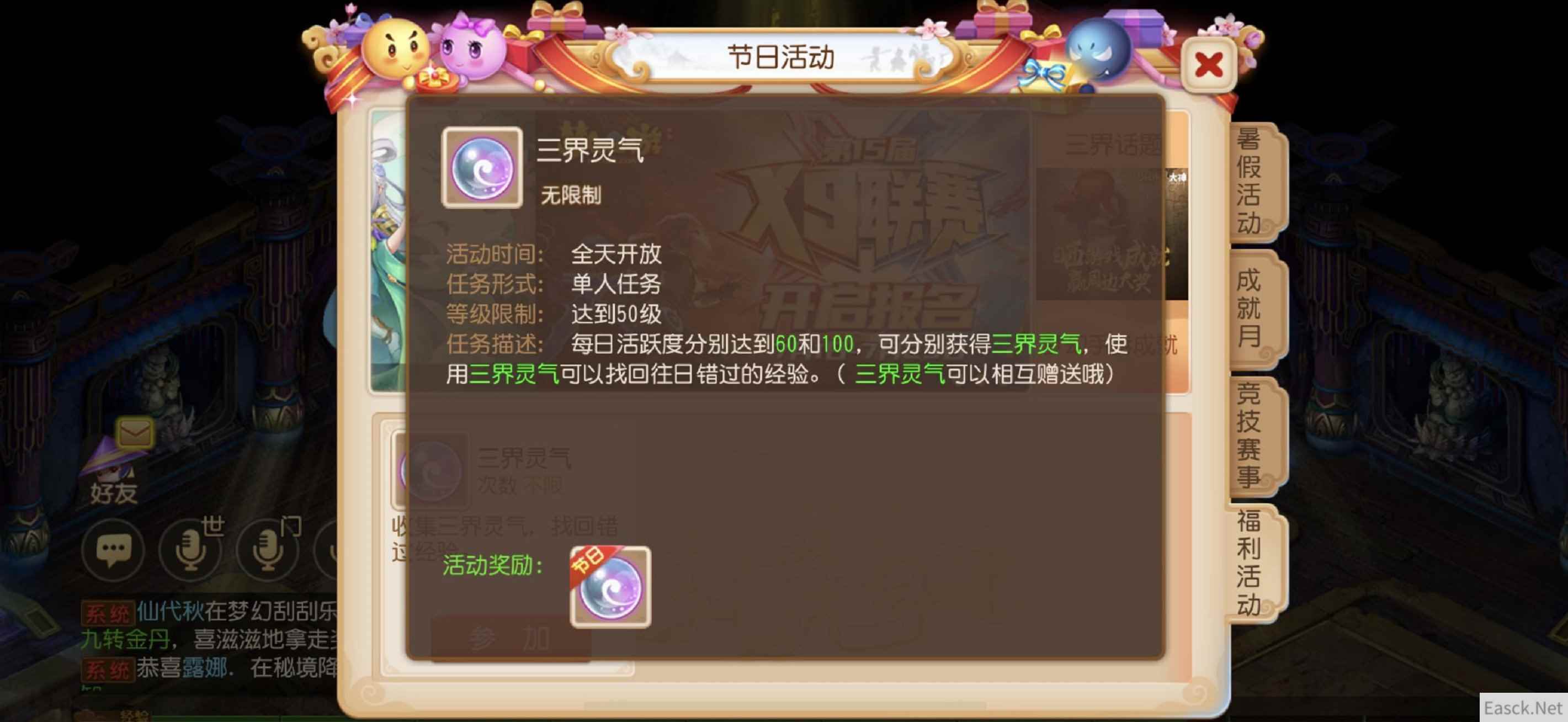 畅享假期,三界灵气助你欢度盛夏 在已经到来的暑假,很多朋友也为自己制订了旅行计划,在现实中与家人朋友多多相处。为了能让这些朋友平衡现实和游戏,《梦幻西游》手游从即日起至8月25日,还特别推出了三界灵气玩法。玩家只要每天活跃度达到60和100,即可获得一个三界灵气,用于找回错失的日常活动经验。 玩家手头多余的三界灵气,还可以赠送给其他好友,让时间不够的好友也能随时跟上大部队!