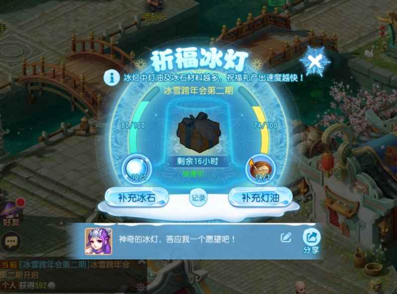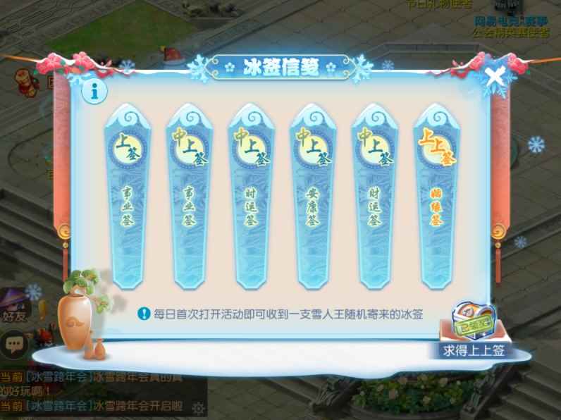 冰签信笺:新的一年新的期待 在新的一年,你会有怎样的新进步呢?在12月31日~1月5日期间,玩家可以在每天首次参与冰灯祈愿和冰签信笺的过程中,了解雪人王对玩家的期许。若是玩家抽到上上签,更能领取雪人王准备的一份神秘大礼!