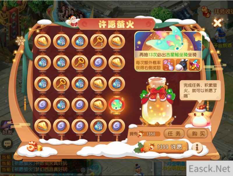 许愿萤火:多重惊喜逐一解锁 在12月24日~1月4日,玩家还可以在许愿萤火活动中,寄托自己对新年的愿望。玩家可以在灯架中选择自己希望获得的各种礼物,并将其放入祈愿灯之中。无论是全新的时装绵云星/胧夜辰,还是新坐骑吉星鳐,亦或是新头饰趴趴猫,都已经隐藏在了祈愿灯中。 玩家只要通过完成任务或使用仙玉获取萤火,即可通过许愿,抽取自己的心仪好物。在此过程中,贴心的吉里也会返还一定萤火给玩家,并为玩家剔除一部分物品,提升玩家获得大奖的概率!