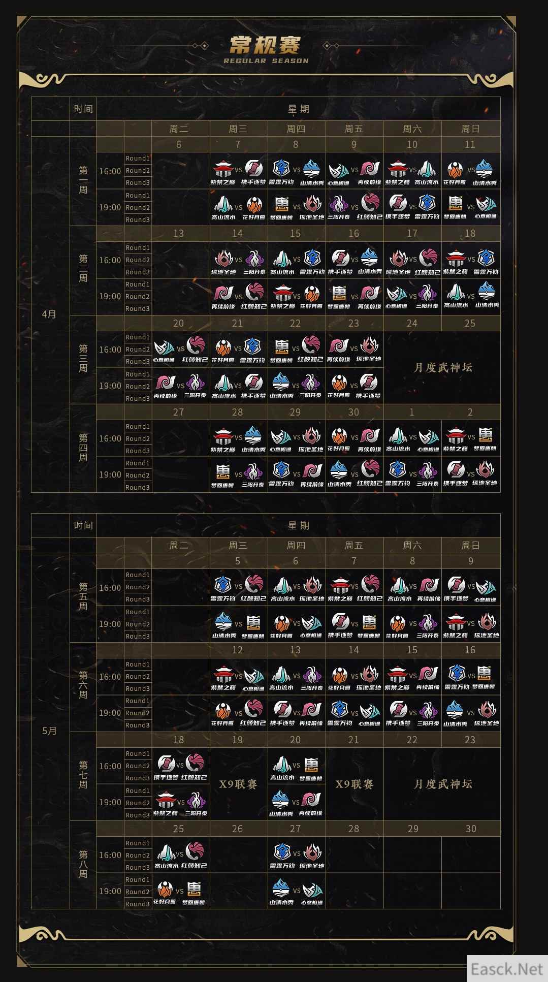 赛程赛制首发 多家平台同步直播 武神坛巅峰联赛S2赛季分为常规赛和季后赛两个阶段,采用线上线下全交互的比赛方式。常规赛将于4月7日-5月27日进行,采用循环积分赛,每场进行RO3对决。在常规赛积分前8名的战队将获得晋级季后赛的资格。季后赛将在6月17日-6月20日进行,并采用更加激烈的双败淘汰制决出武神坛巅峰联赛总冠军。