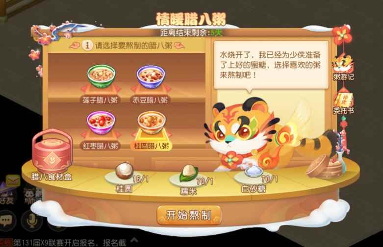 粥游三界,与超级神虎探寻美食本源 腊八粥是腊八节的传统美食,一碗热气腾腾的腊八粥曾温暖过无数行色匆匆的游子。现在,玩家只要完成师门、捉鬼、因缘绘副本、秘境降妖等日常任务,就能获取各种腊八食材。接下来,玩家可以使用这些食材,根据特定食谱烹饪出不同口味的腊八粥,并将其赠送给天命取经人以兑换各类临时符。 而伴随着玩家与取经人间好感度的不断提升,玩家将触发取经人结识任务,带着超级神虎前往完成任务,就可以领取超级神虎转盘大奖! 此外,玩家还可以在活动期间每日查询超级神虎发布的五个委托任务,选择完成其中两个任务,获得更多神虎幸运转盘体验机会!