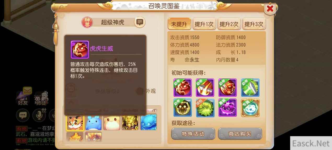 虎虎生威,战场之上尽显身手 超级神虎,与梦同行。《梦幻西游》手游虎年专属神兽超级神虎共拥有五个技能,其中专属绑定技能虎虎生威能够让它在普通攻击造成伤害后,有25%概率触发特殊连击,继续攻击目标一次。若玩家将其配合连击/高级连击,则超级神虎每次出手可攻击1~4次。其专属内丹初心焰、召唤灵套装则分别提升了自身连击/高级连击以及虎虎生威的触发概率,从而使其在战斗中拥有更强大的爆发力。而超级神虎的另外两大绑定技能——高级连击和高级偷袭,更是大大强化了它的物理输出爆发力。我们相信,这只神兽一定能在之后的战斗中成为突破对手防线的重要生力军! 现在,玩家不仅能够通过参与腊八节活动与超级神虎结缘,也能在2月8日之前,使用神兜兜通过袁天罡进行兑换,让自己在第一时间体验它的澎湃力量!