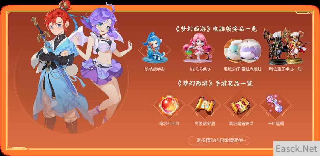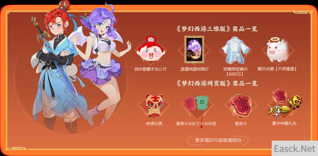 梦幻西游嘉年华跨年晚会期间,《梦幻西游》电脑版开放抽取杀破狼手办、桃夭夭手办、毗舍童子手办等奖品,《梦幻西游》手游抽奖赠送超级幻色丹、高级藏宝图、高级魔兽要决等奖励,《梦幻西游三维版》推出剑侠客暖手宝公仔、浪漫桃园纸雕灯、珍惜限定锦衣“如初见”等精美礼物进行抽奖,《梦幻西游网页版》将抽取神虎玩偶、荟英令&妖王令充电宝、豪华神兽礼包等限定礼品。心动不如行动,少侠们快快调好闹钟,静待梦幻西游嘉年华跨年晚会大幕拉开的那一刻!